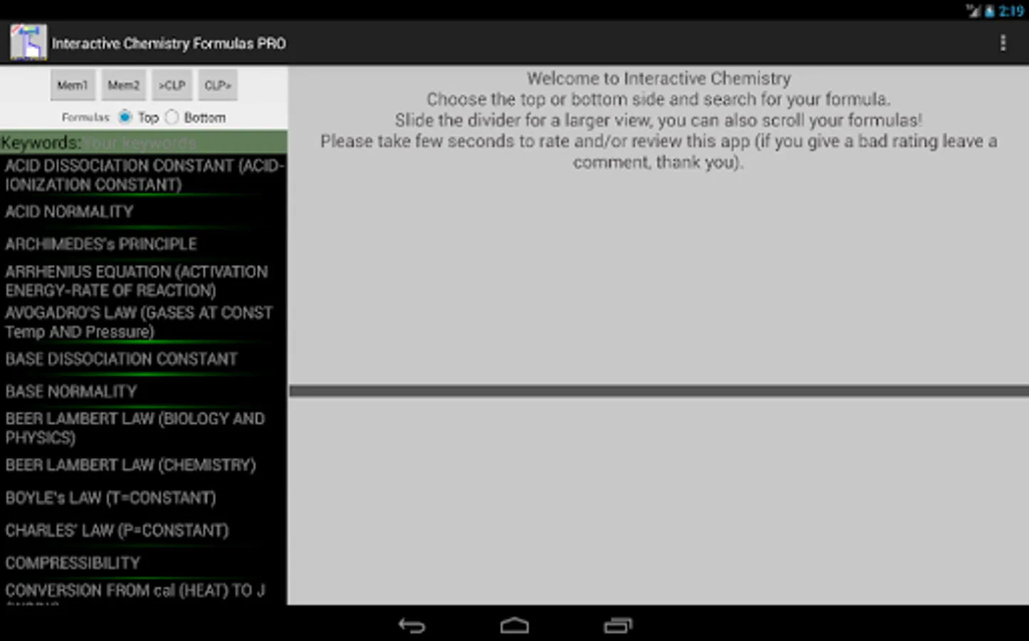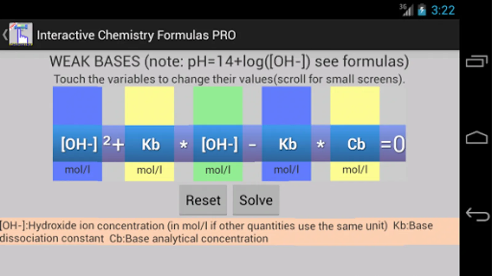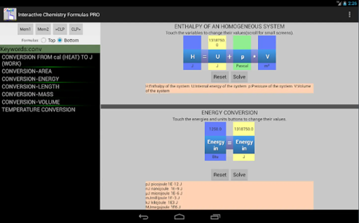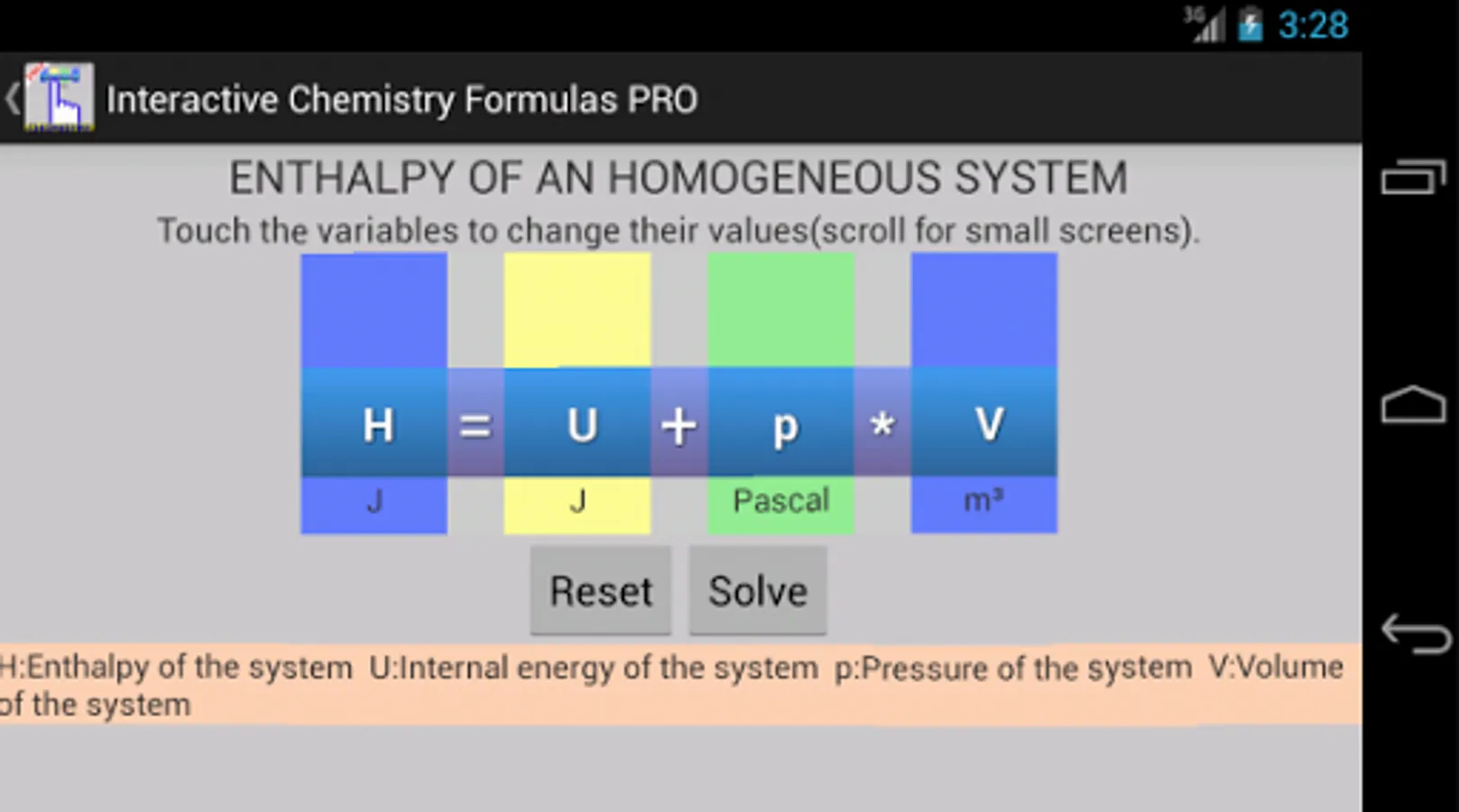 Interactive Chemistry PRO is ideal for students and graduates, you will find a variety of useful formulas for your daily calculus, you can enter a value by touch and solve any variable of the equation, the interactive feature of the formulas makes it easy to avoid typing or human errors.