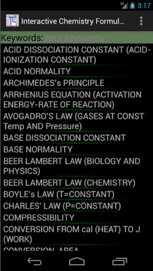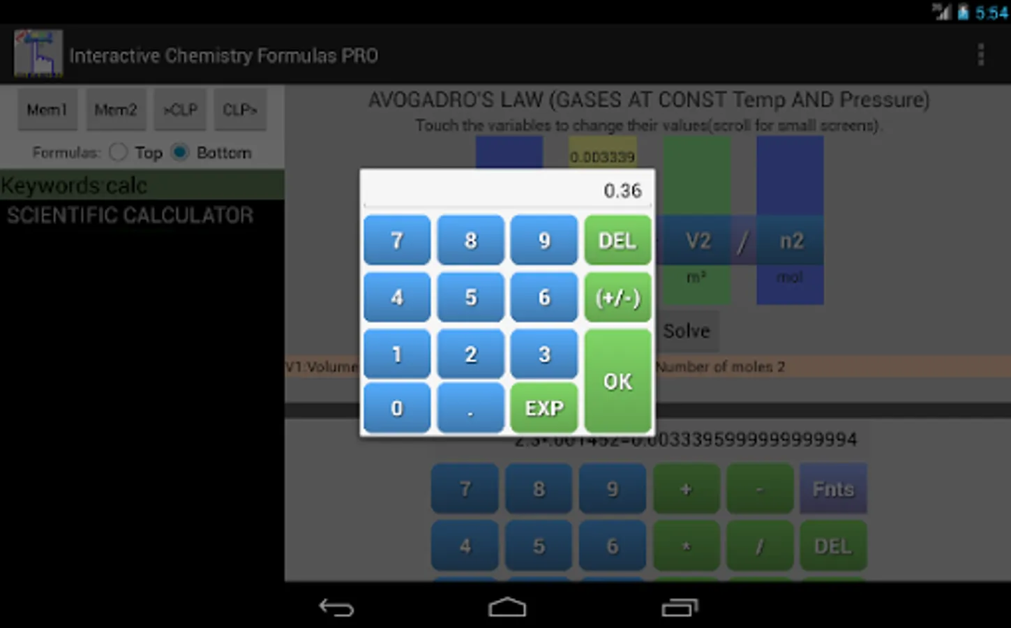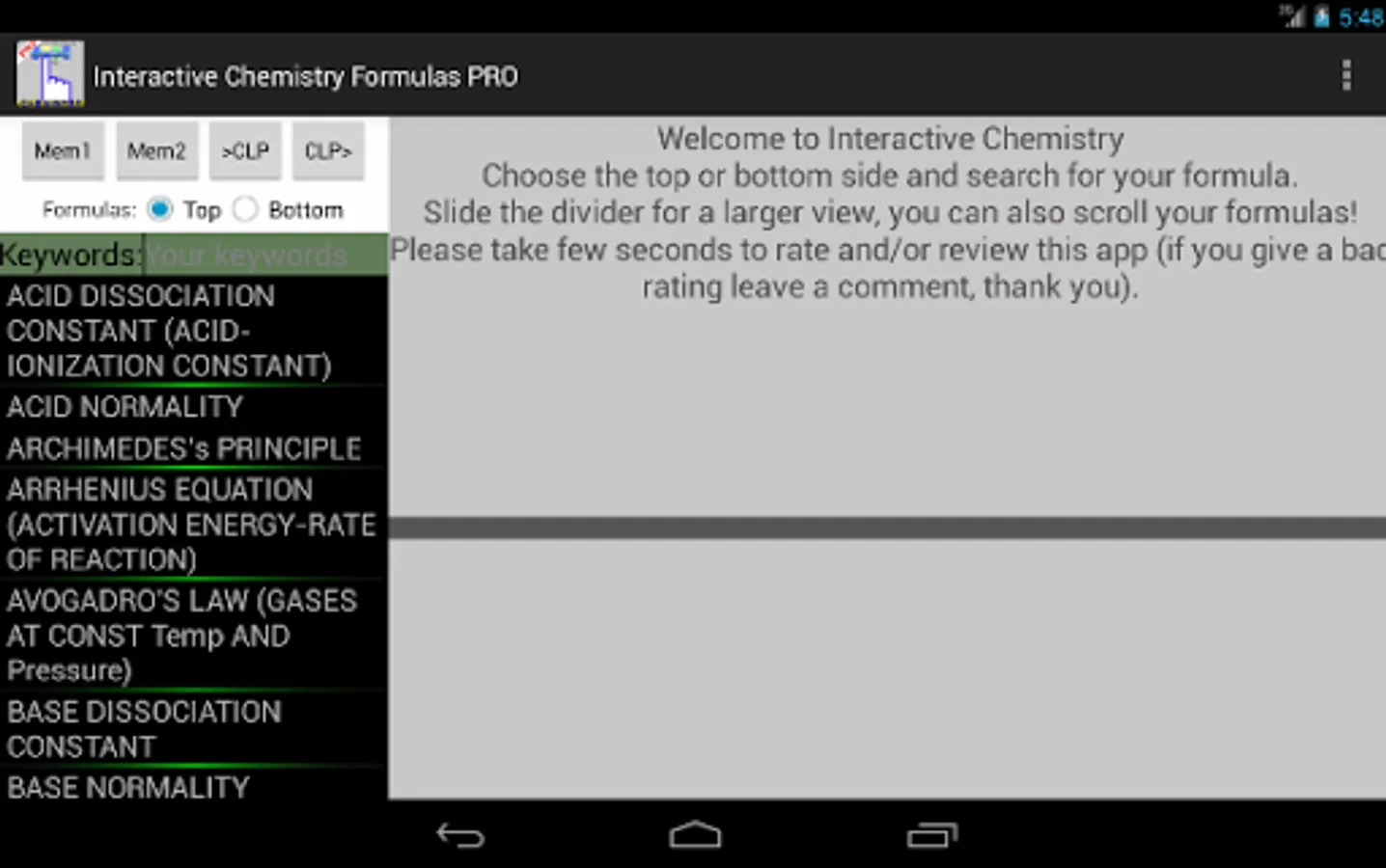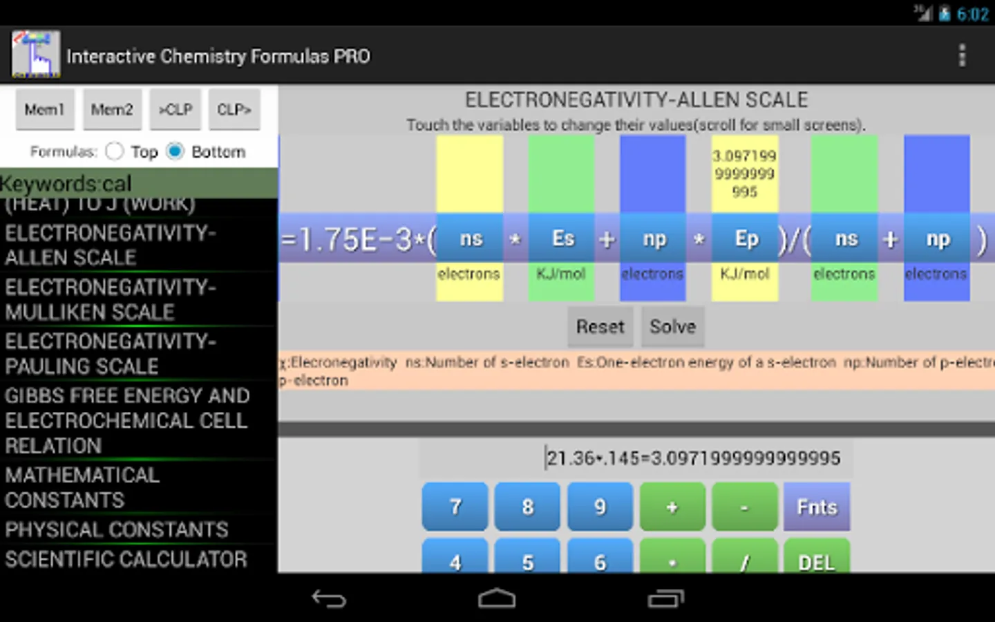 Interactive Chemistry PRO is ideal for students and graduates, you will find a variety of useful formulas for your daily calculus, you can enter a value by touch and solve any variable of the equation, the interactive feature of the formulas makes it easy to avoid typing or human errors.