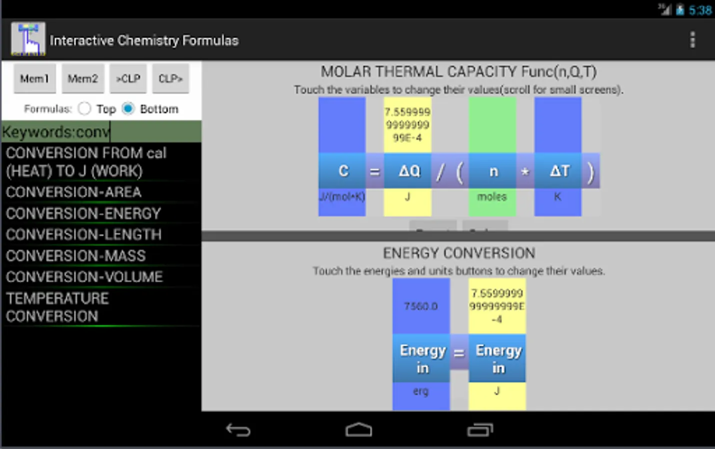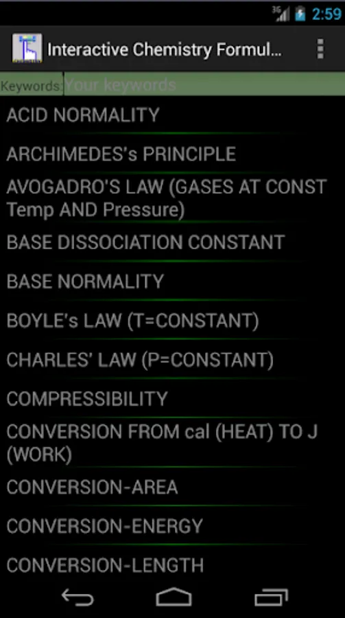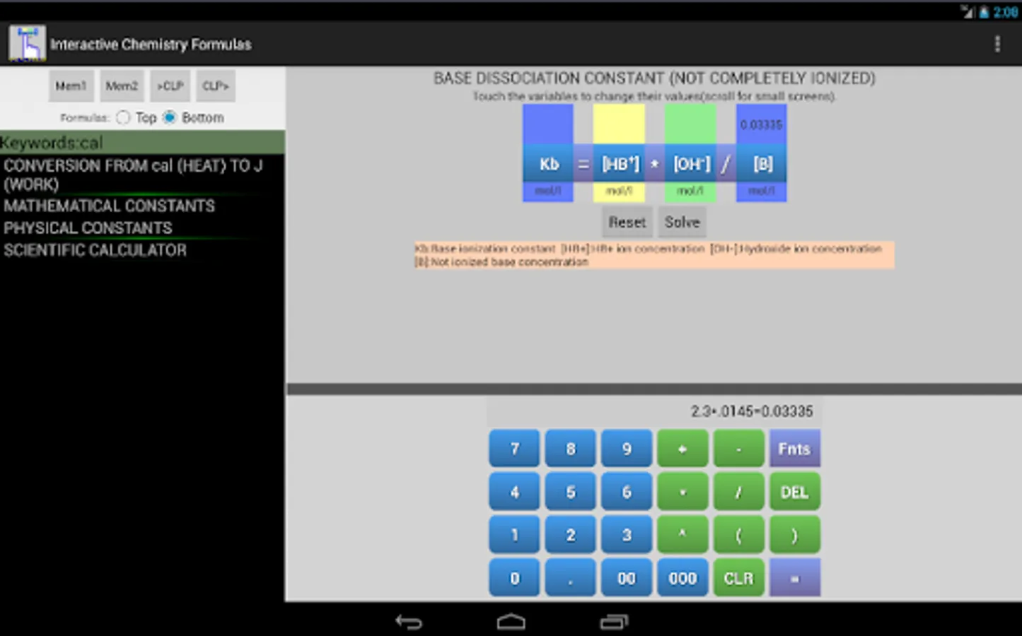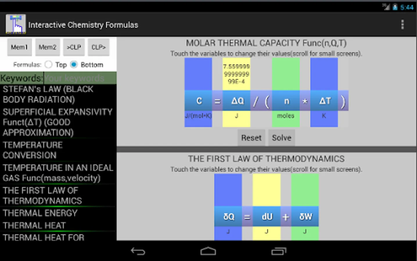 This app and chemistry calculator is ideal for students and graduates, you will find a variety of useful formulas for your daily calculus, you can enter a value by touch and solve any variable of the equation, the interactive feature of the formulas makes it easy to avoid typing or human errors.