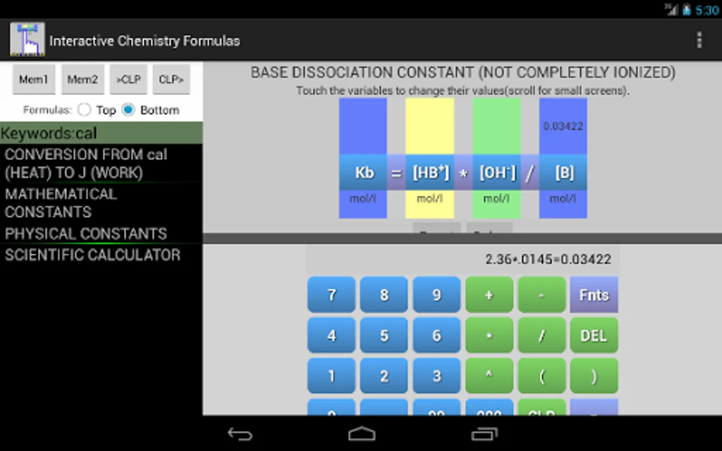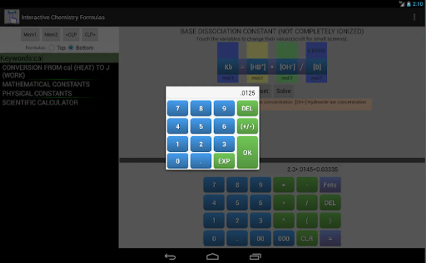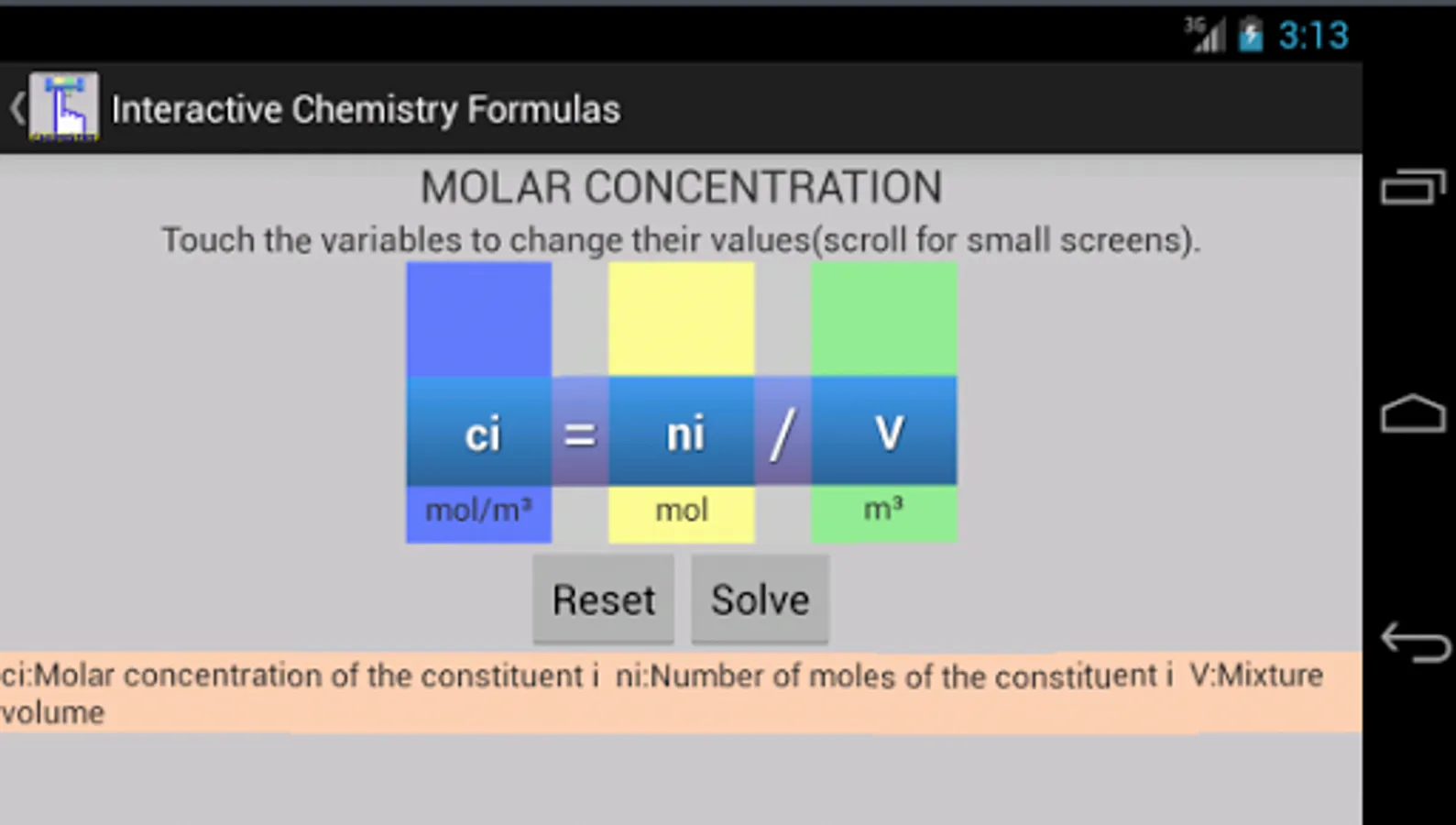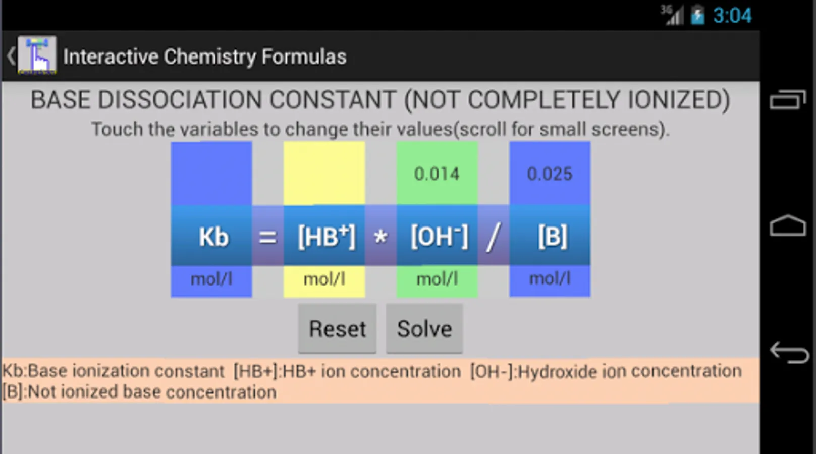 This app and chemistry calculator is ideal for students and graduates, you will find a variety of useful formulas for your daily calculus, you can enter a value by touch and solve any variable of the equation, the interactive feature of the formulas makes it easy to avoid typing or human errors.
