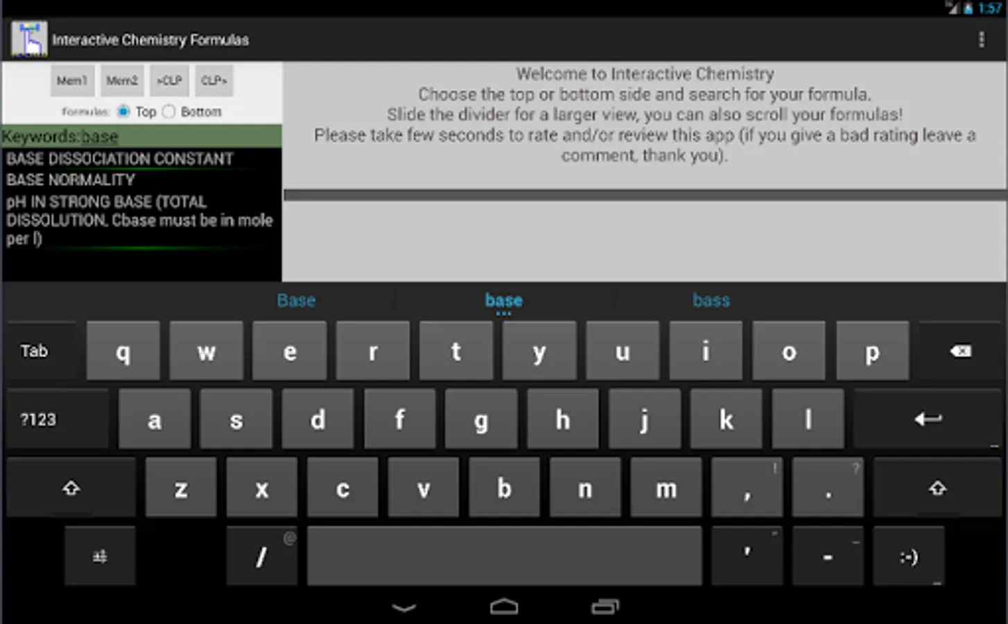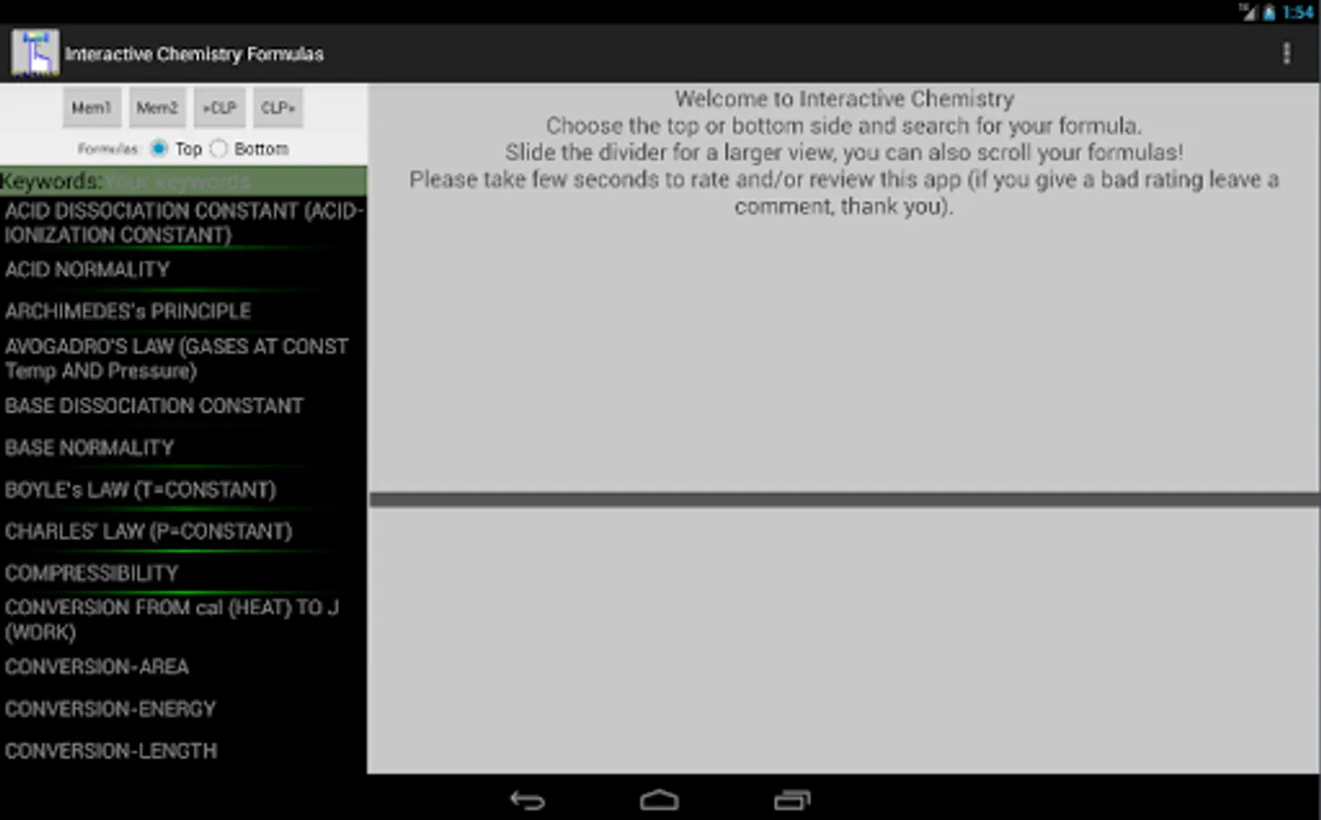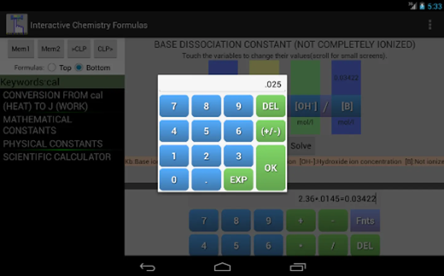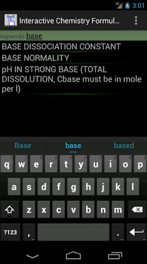This app and chemistry calculator is ideal for students and graduates, you will find a variety of useful formulas for your daily calculus, you can enter a value by touch and solve any variable of the equation, the interactive feature of the formulas makes it easy to avoid typing or human errors.