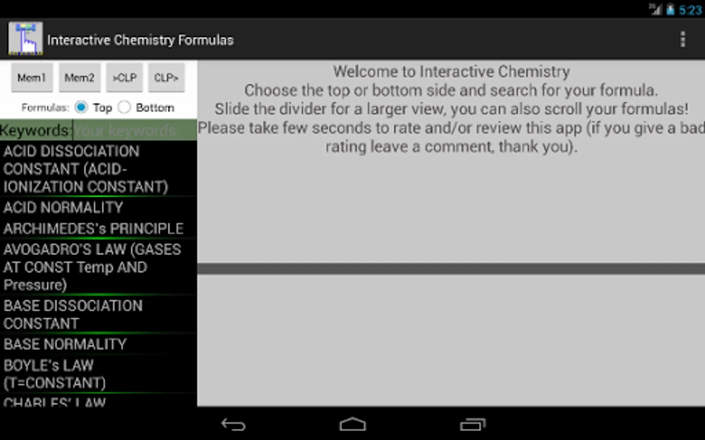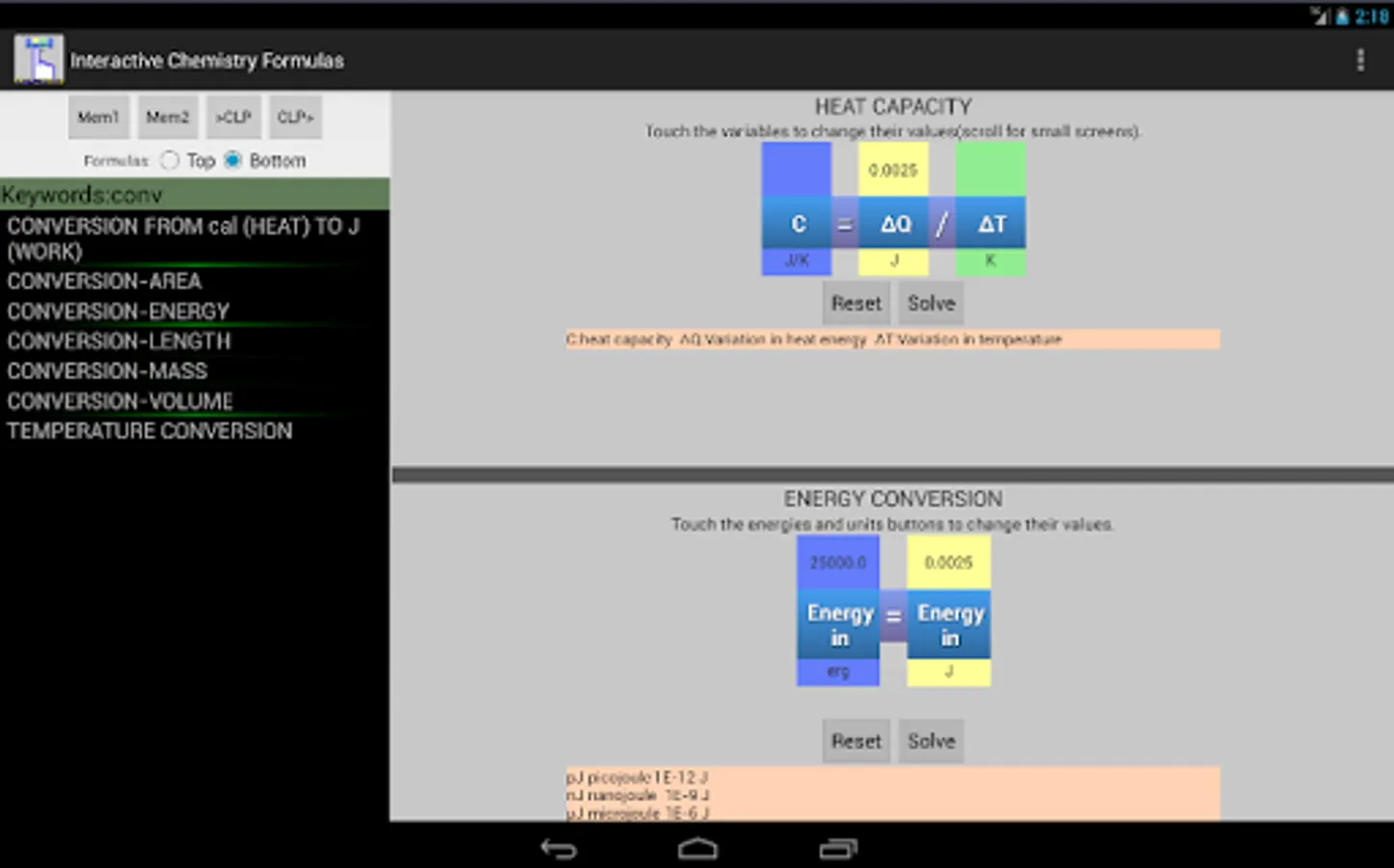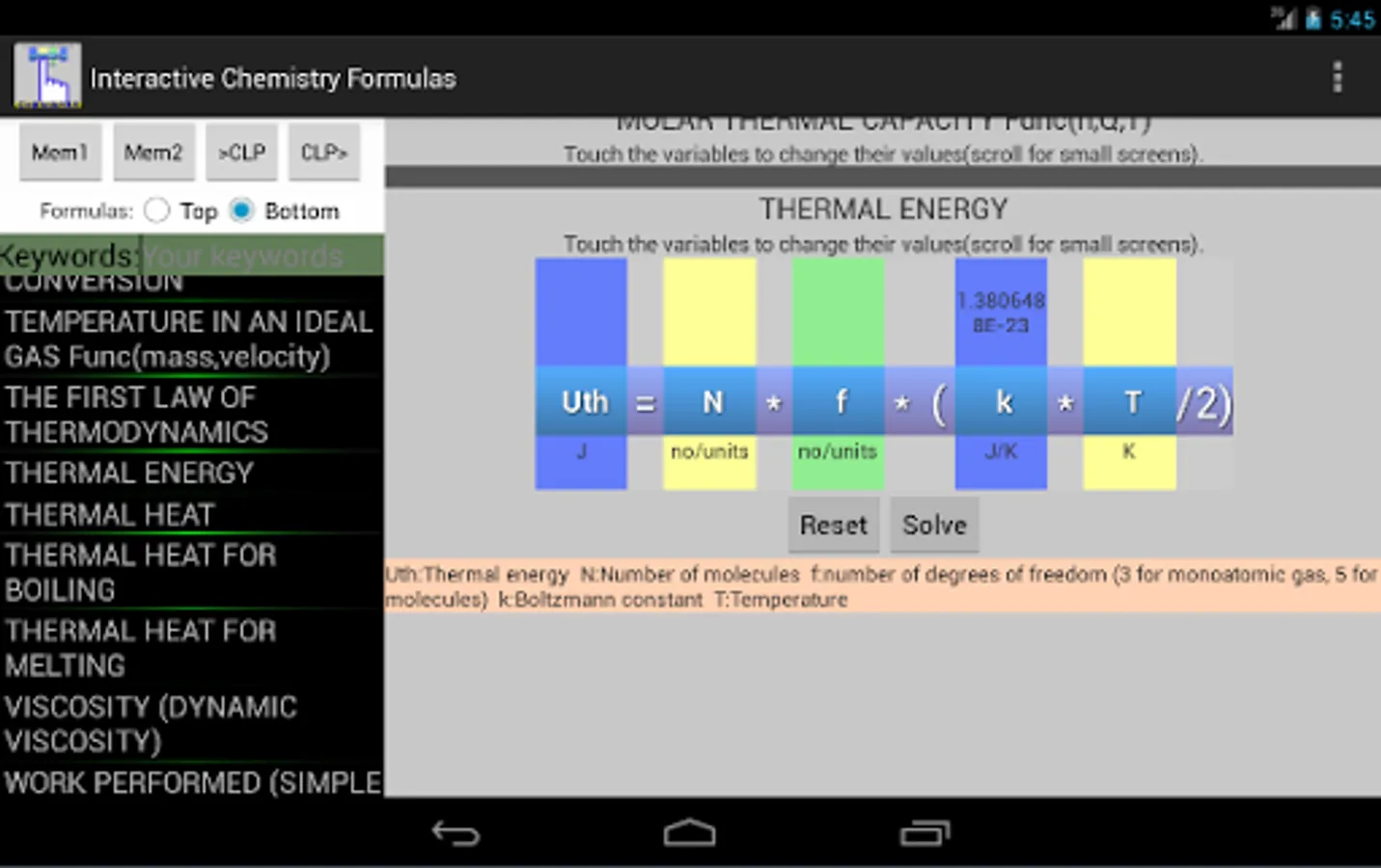 In this app there are more than 50 formulas covering various topics like: chemical reactions, chemical interactions, thermochemistry, thermodynamics, electrochemistry etc. The interface is made in a way that you can see above any variable it's value.