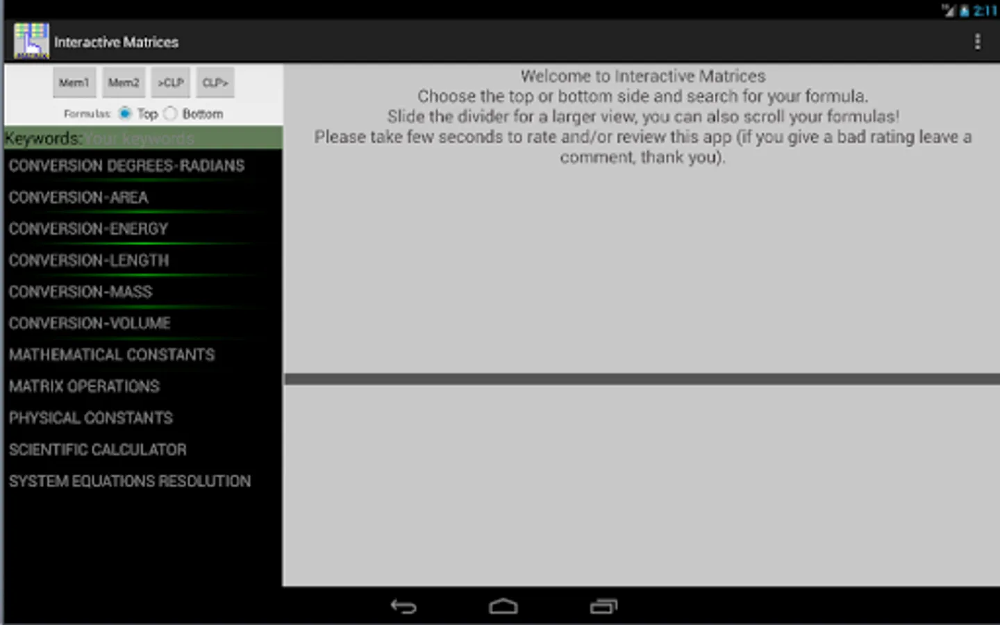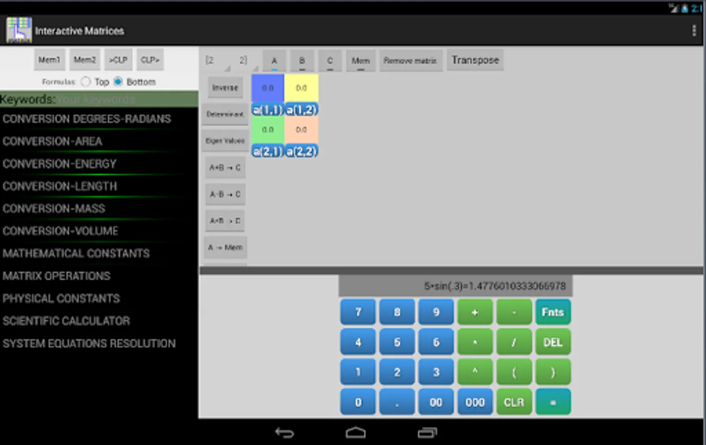 "Interactive Matrices PRO" is ideal for students and graduates, you will find a variety of useful tools for matrix calculus and you can enter a value by touch, the interactive feature make it easy to avoid typing or human errors.
