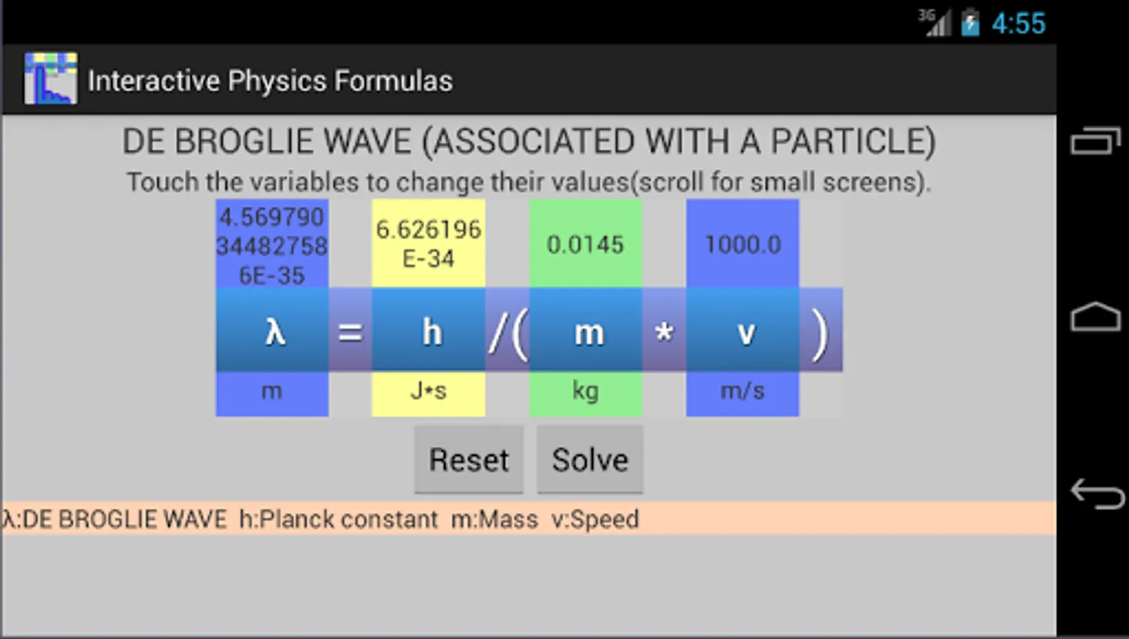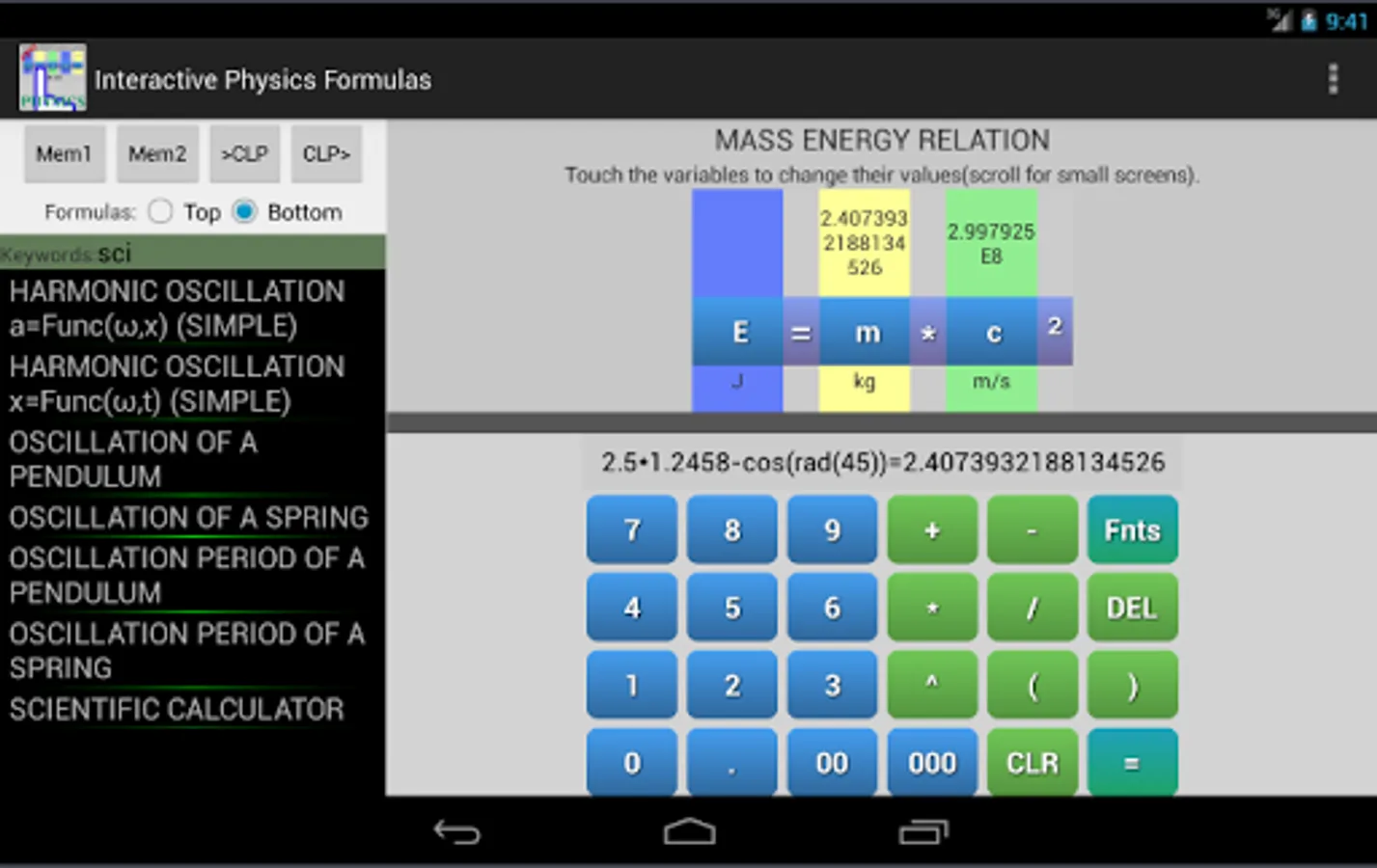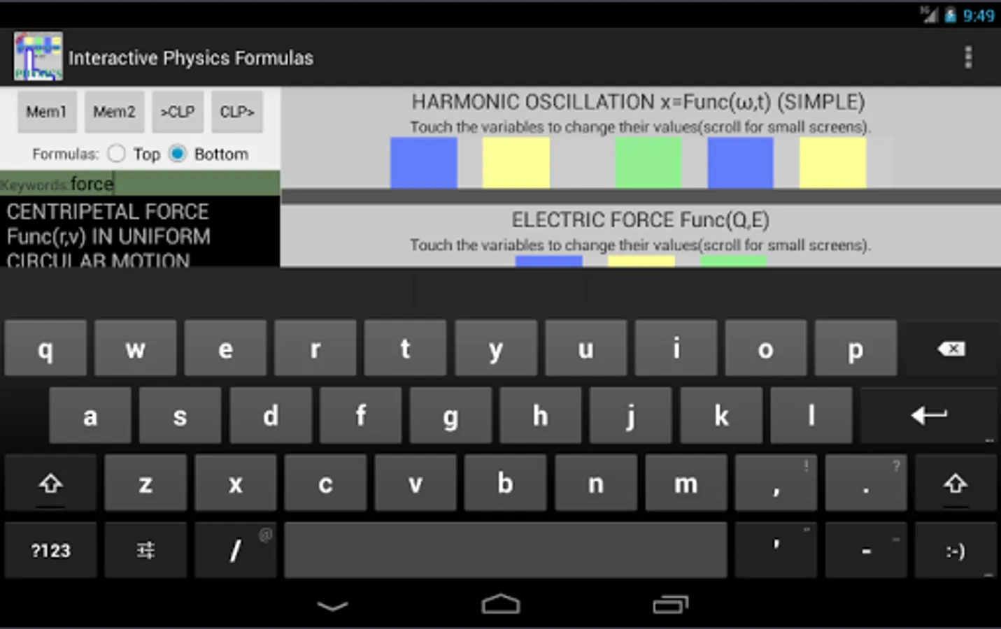 In this app there are more than 250 formulas covering various topics like: Newtonian mechanics, waves, electricity, relativity etc. The interface is made in a way that you can see above any variable it's value.