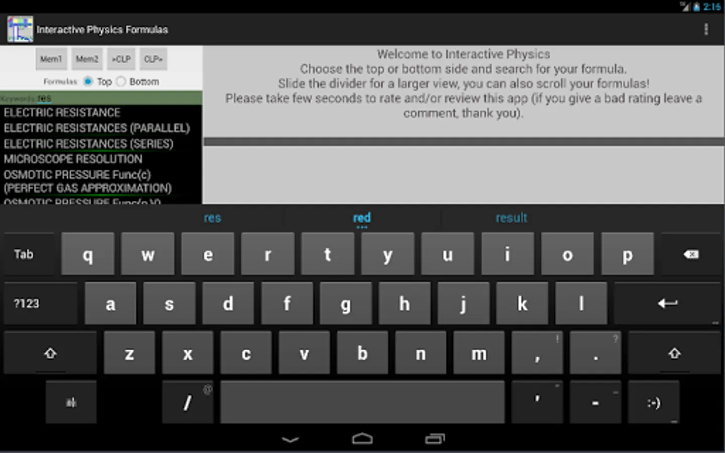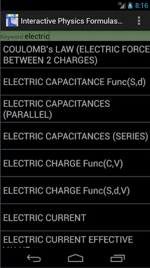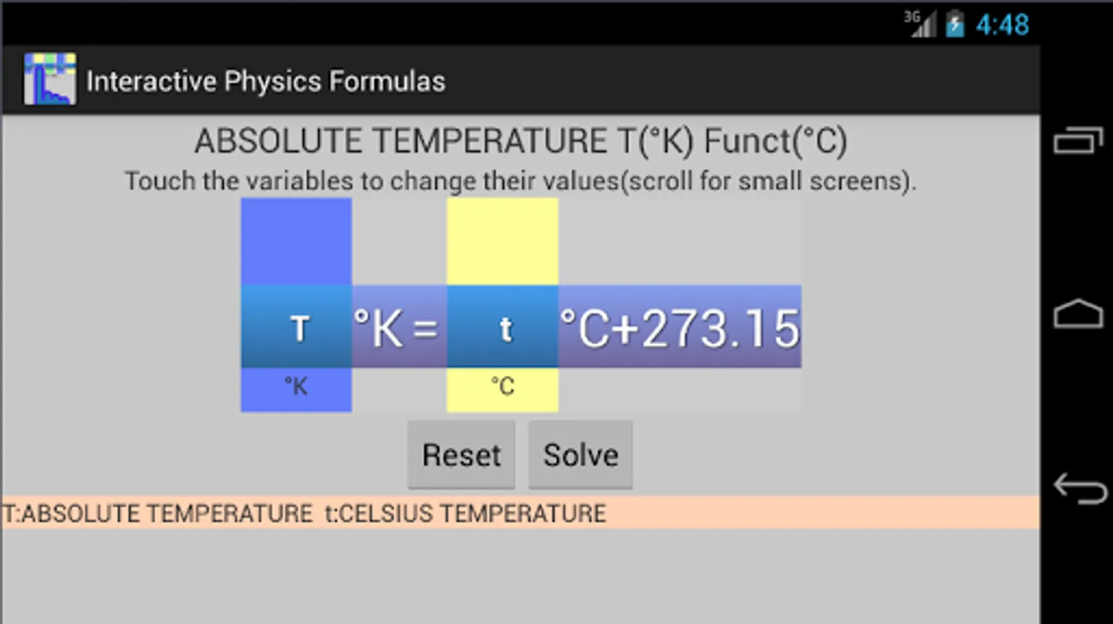 In this app there are more than 250 formulas covering various topics like: Newtonian mechanics, waves, electricity, relativity etc. The interface is made in a way that you can see above any variable it's value.