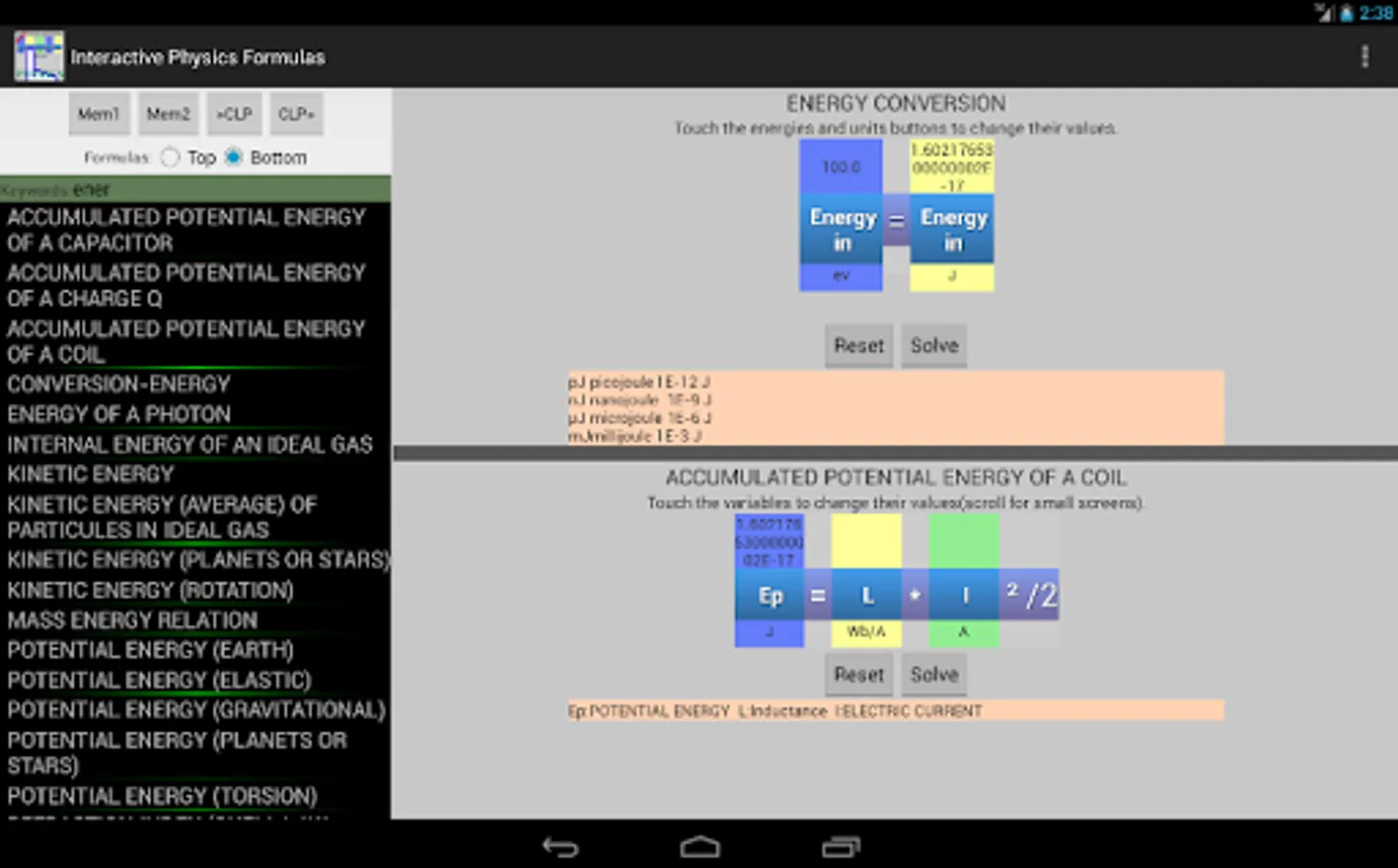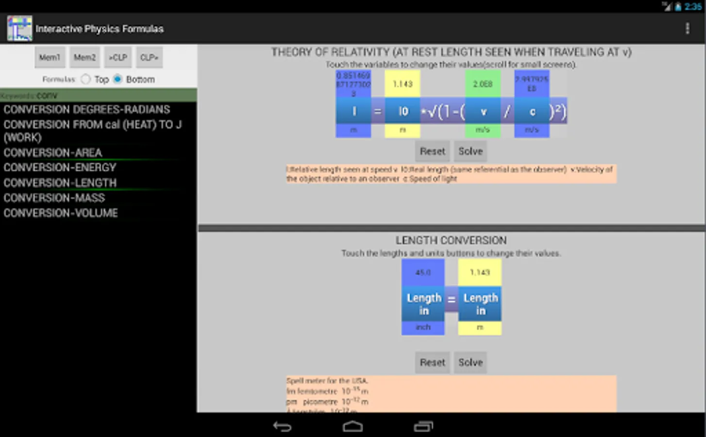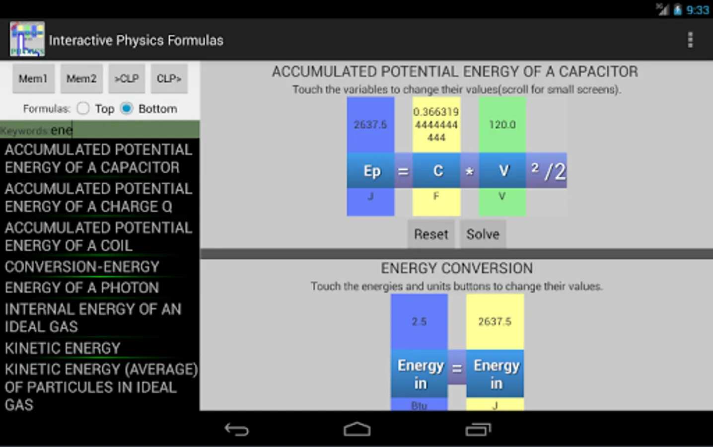 "Interactive Physics PRO" or simply physics calculator is ideal for students and graduates, you will find a variety of useful formulas and tools for your daily calculus, you can enter a value by touch and solve any variable of the equation, the interactive feature of the formulas makes it easy to avoid typing or human errors.