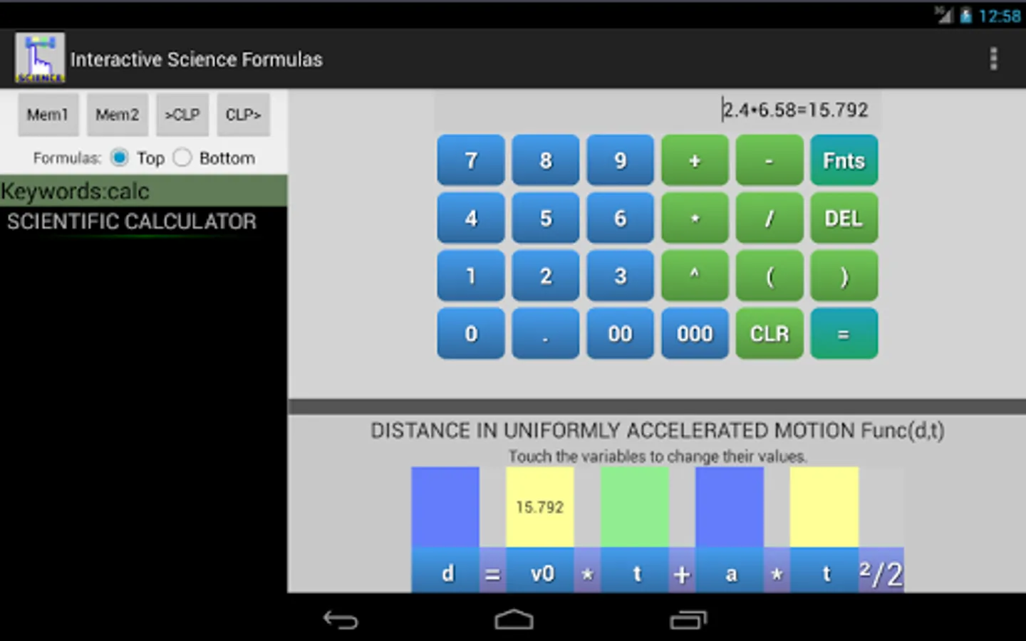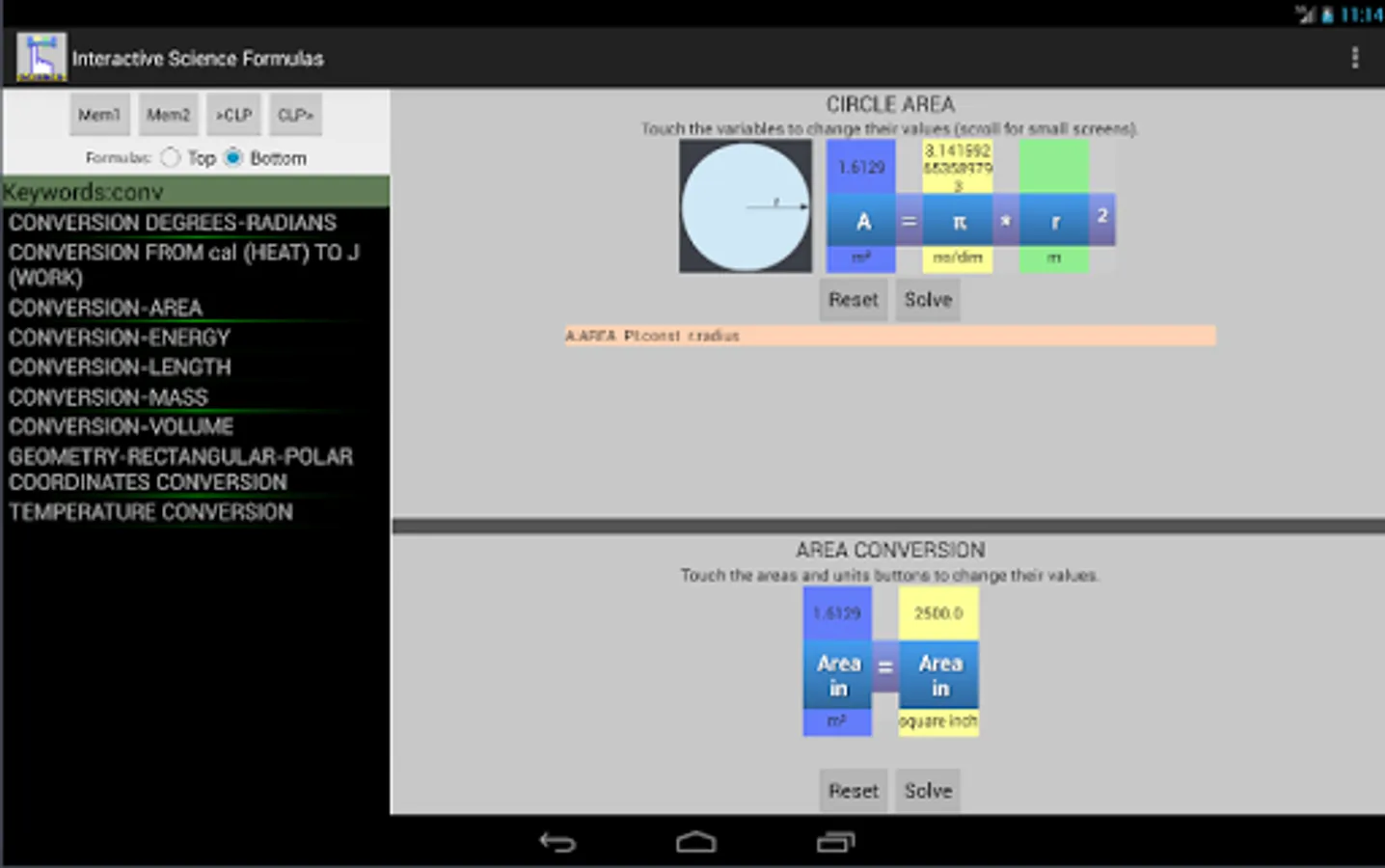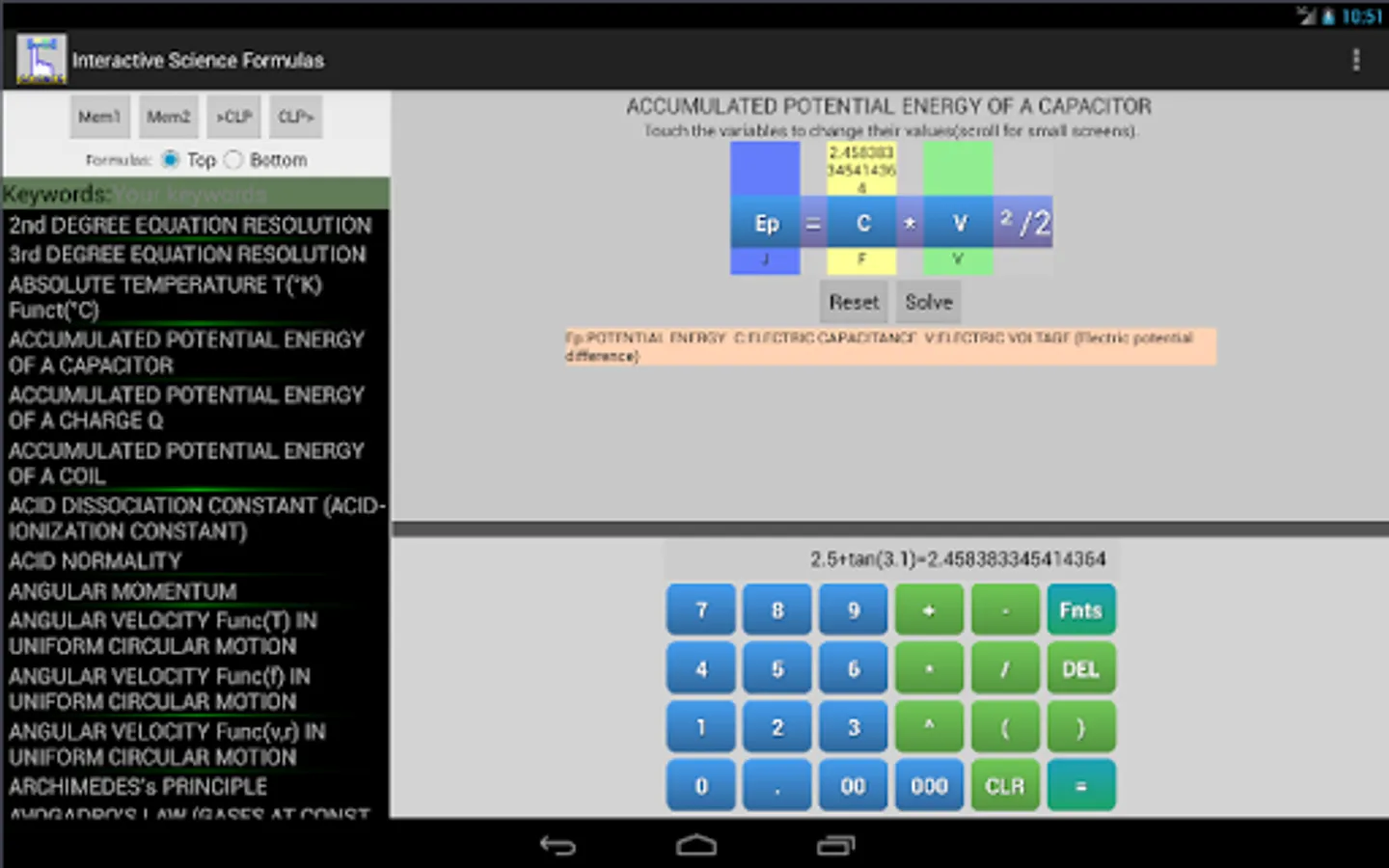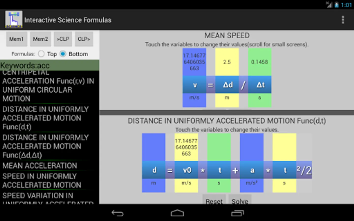 This app is ideal for students and graduates, you will find a variety of useful formulas and tools for your daily calculus, you can enter a value by touch and solve any variable of the equation, the interactive feature of the formulas makes it easy to avoid typing or human errors.