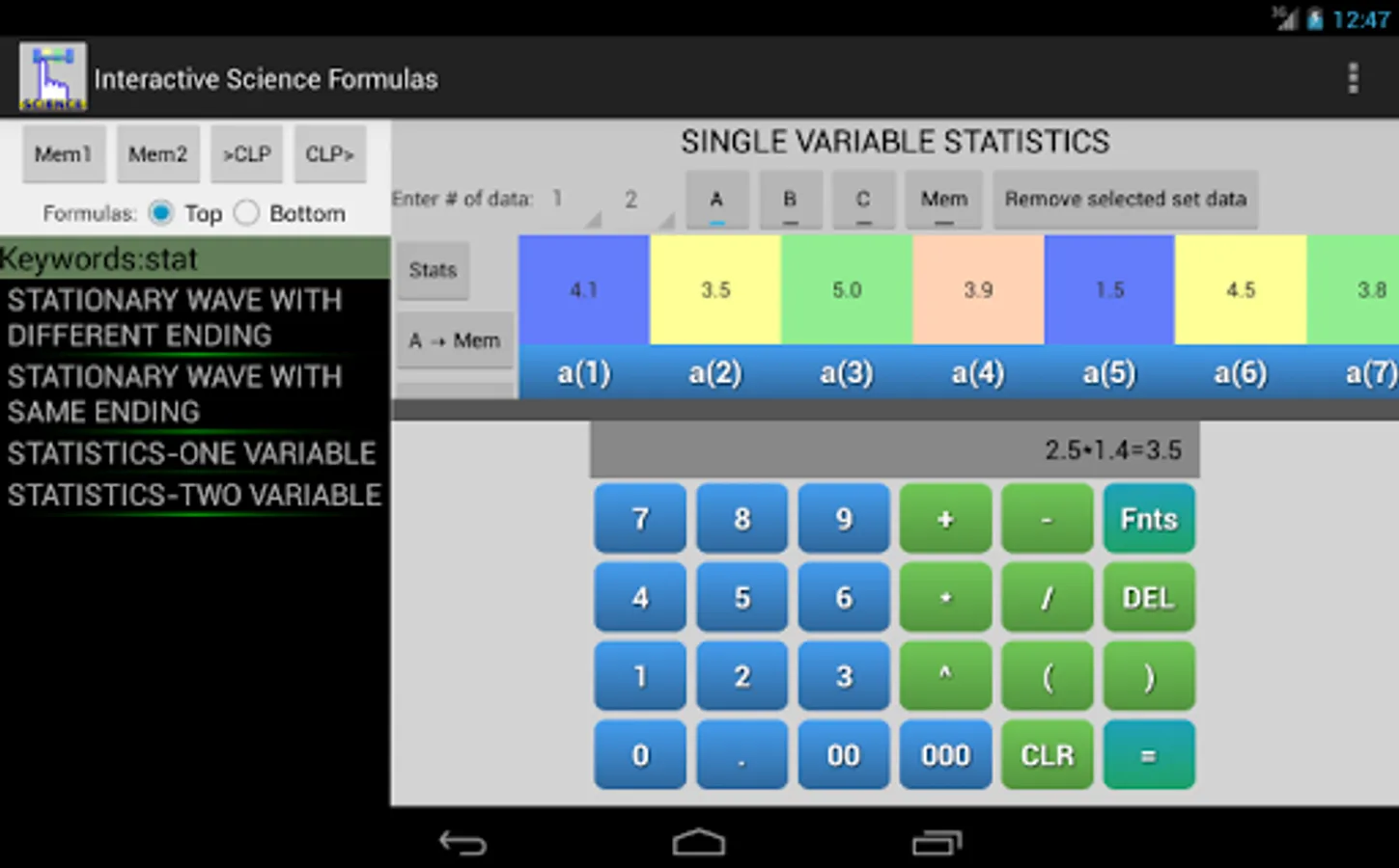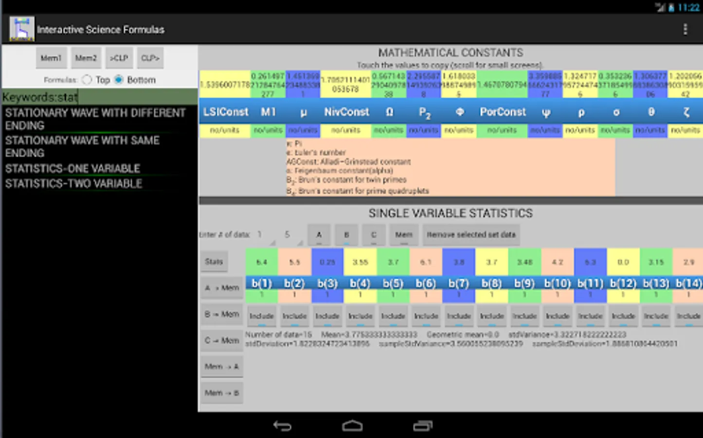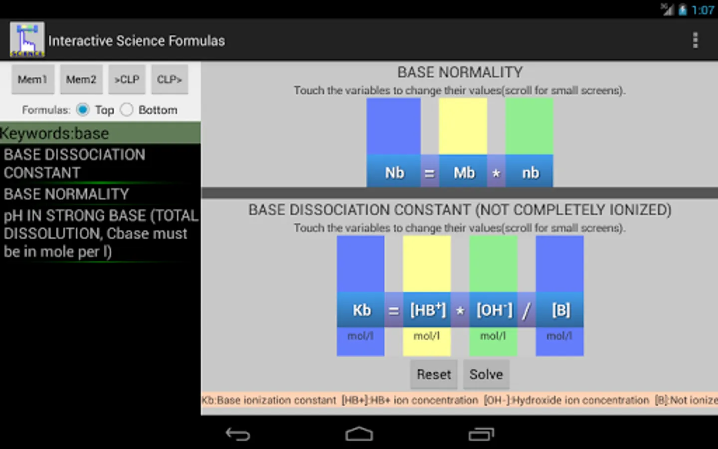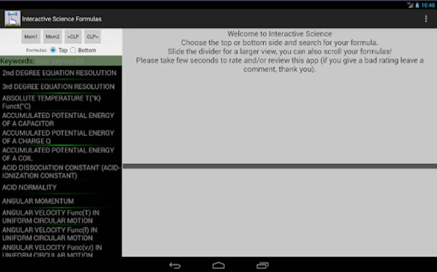 This app is ideal for students and graduates, you will find a variety of useful formulas and tools for your daily calculus, you can enter a value by touch and solve any variable of the equation, the interactive feature of the formulas makes it easy to avoid typing or human errors.