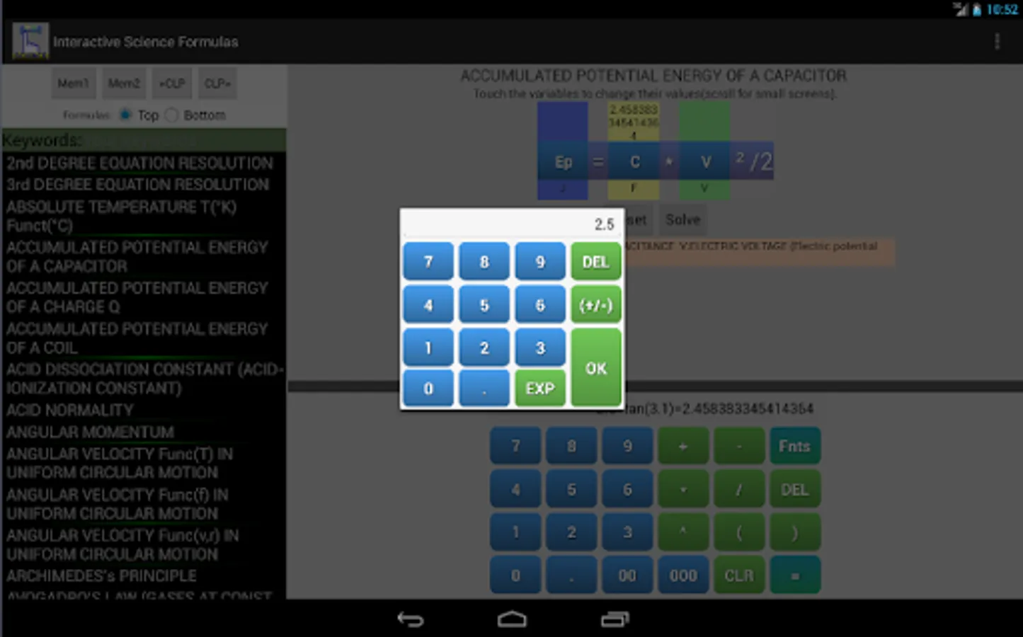 In this modern scientific calculator there are more than 250 (equivalent to more than 900 because of the inner variables calculus)formulas and tools covering various topics like: