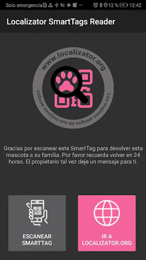 App to scan SmartTags. SmartTags are a localizator.org product to identify and locate lost pets. It no need battery or internet connection because works using the resources of the phone that scans the QR. To know more please visit as at http://www.localizator.org
