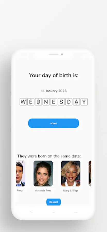 In addition to telling you what day of the week you were born, our app also lets you discover interesting information about your star sign and celebrities who were born on the same day as you. This allows you to discover famous personalities that you share on a birthday and share them with your friends and family.