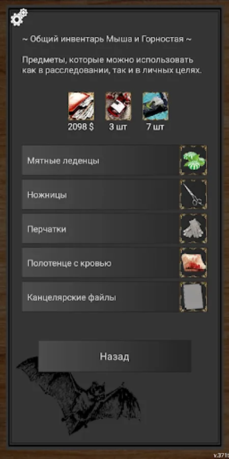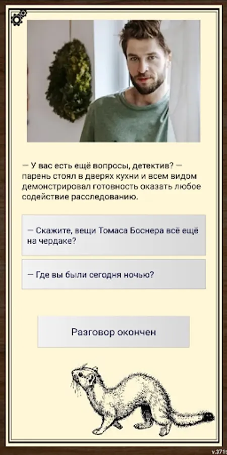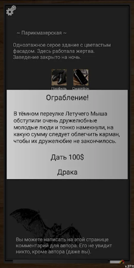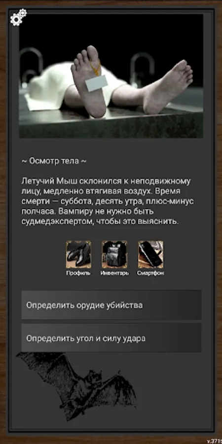 Here is a text quest investigation of five chapters with ten possible endings. In search of a killer you have to plunge into the atmosphere of mysticism and black humor, at every step faced with the temptations and dangers unknown to mortals.