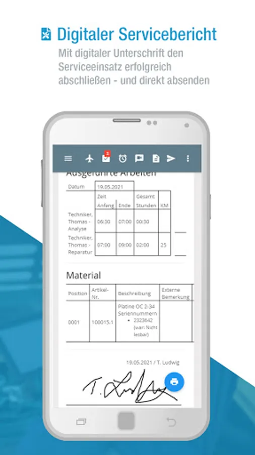 With the use of the L-mobile service app, you can rely on efficient service management, which provides the basis for timely billing through the feedback of times, material and digital service reports from your service technicians in real time.