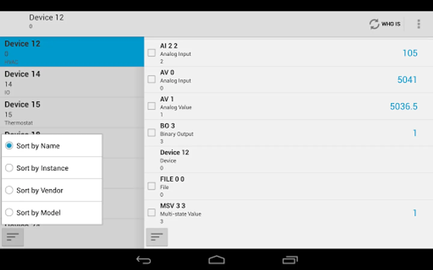 ✔ Devices can be sorted by name, instance, vendor or model.