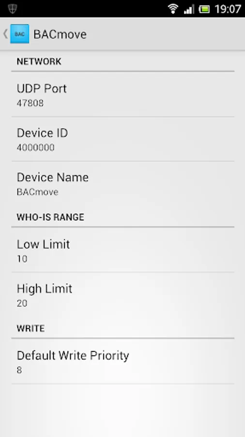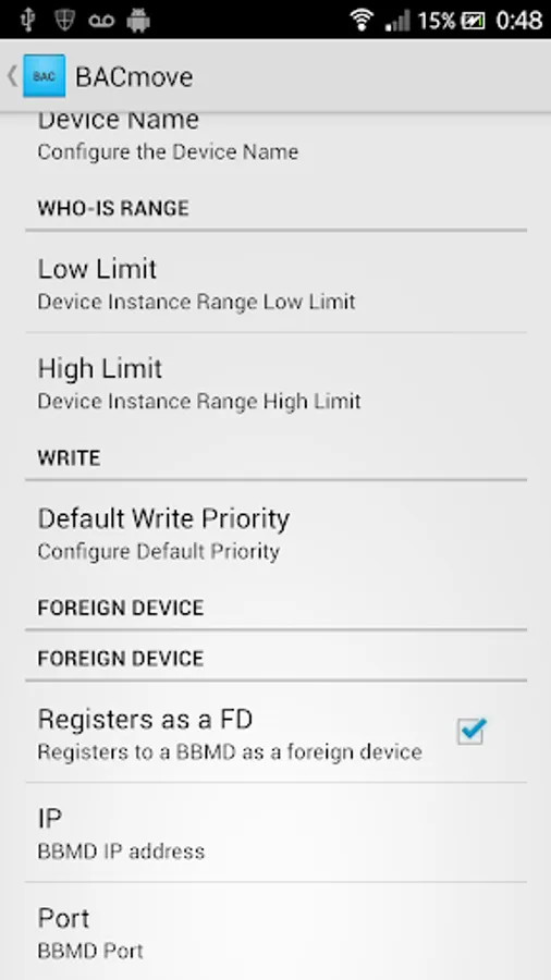 ✔ Configuration: UDP port, Device Id and Device Name, Who-Is device instance range, default write priority, Foreign Device.