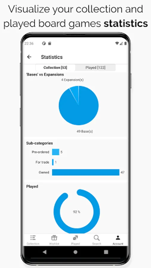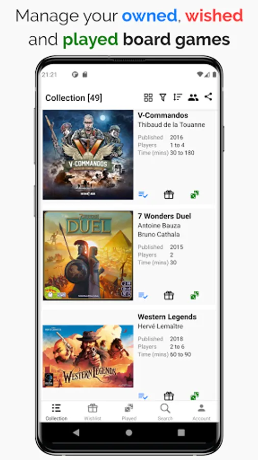 * Save and synchronize your board games (owned, wished and played) with BoardGameGeek.com (BGG)
