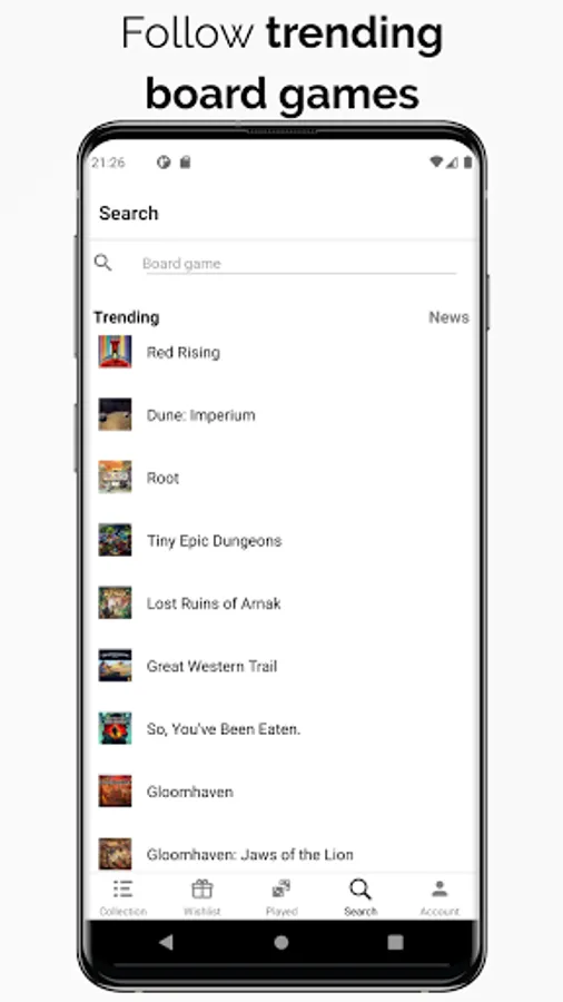 All modern board games can be searched whereas you are looking for card games or tabletop games, except for children games. The application uses the biggest game database in the world : BoardGameGeek