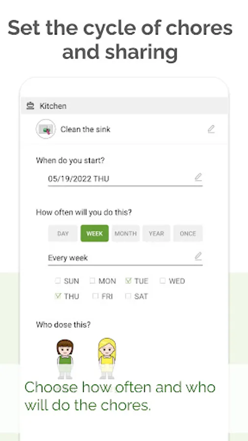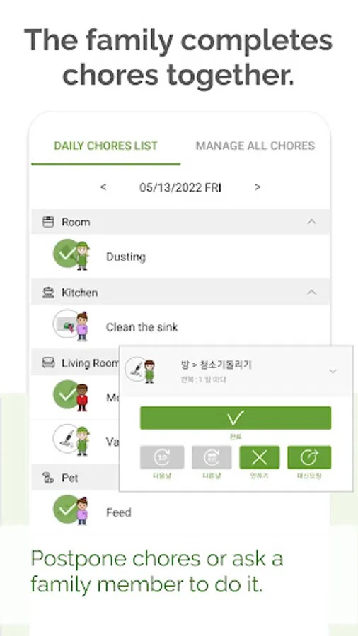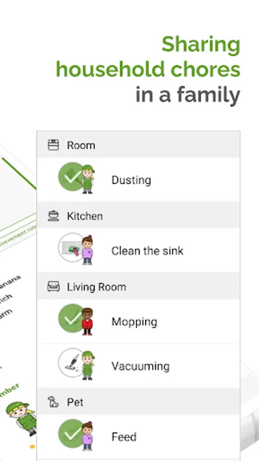 You can invite your family to your house and share the chores. Each avatar is displayed next to the task. So you can tell who's doing what. Family members can ask for or do housework for each other. You can find out how many household chores among members are in percentage.