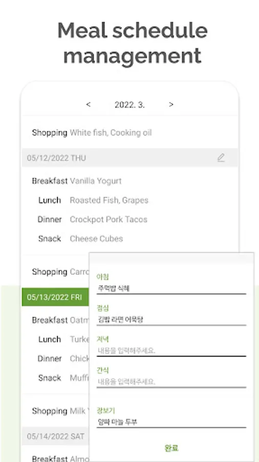 Make a meal plan and make a shopping list. The home screen informs you of today's meals and lists, making it easy to prepare meals.