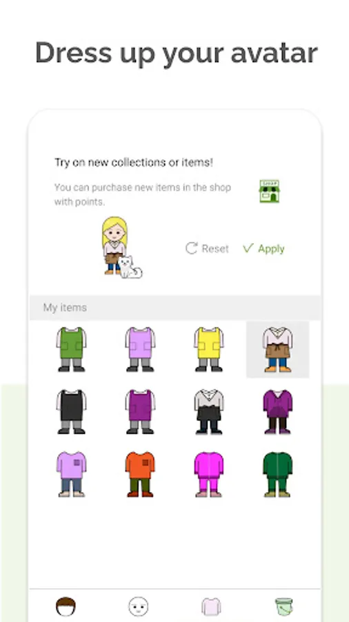 You can collect points by completing today's chores or playing a point game. Let's decorate my avatar with your points.
