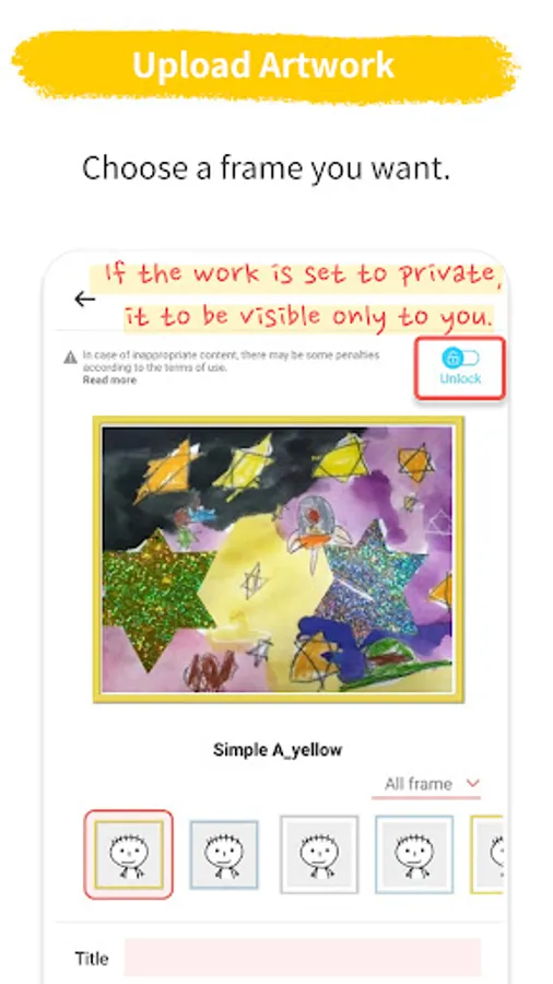 # Upload your kid's artwork. The works are displayed in the kid's atelier.