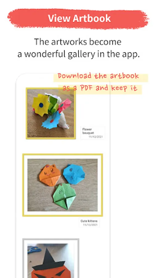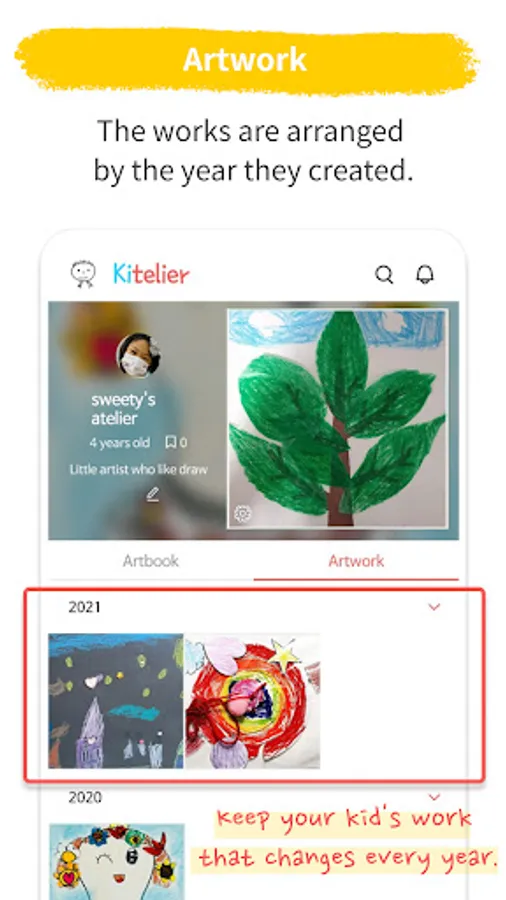 The date created artwork is entered, so it is saved according to the age of the child. Create artbooks (folders) by subject to categorize your child's works. You can easily find the works you want to see at any time.