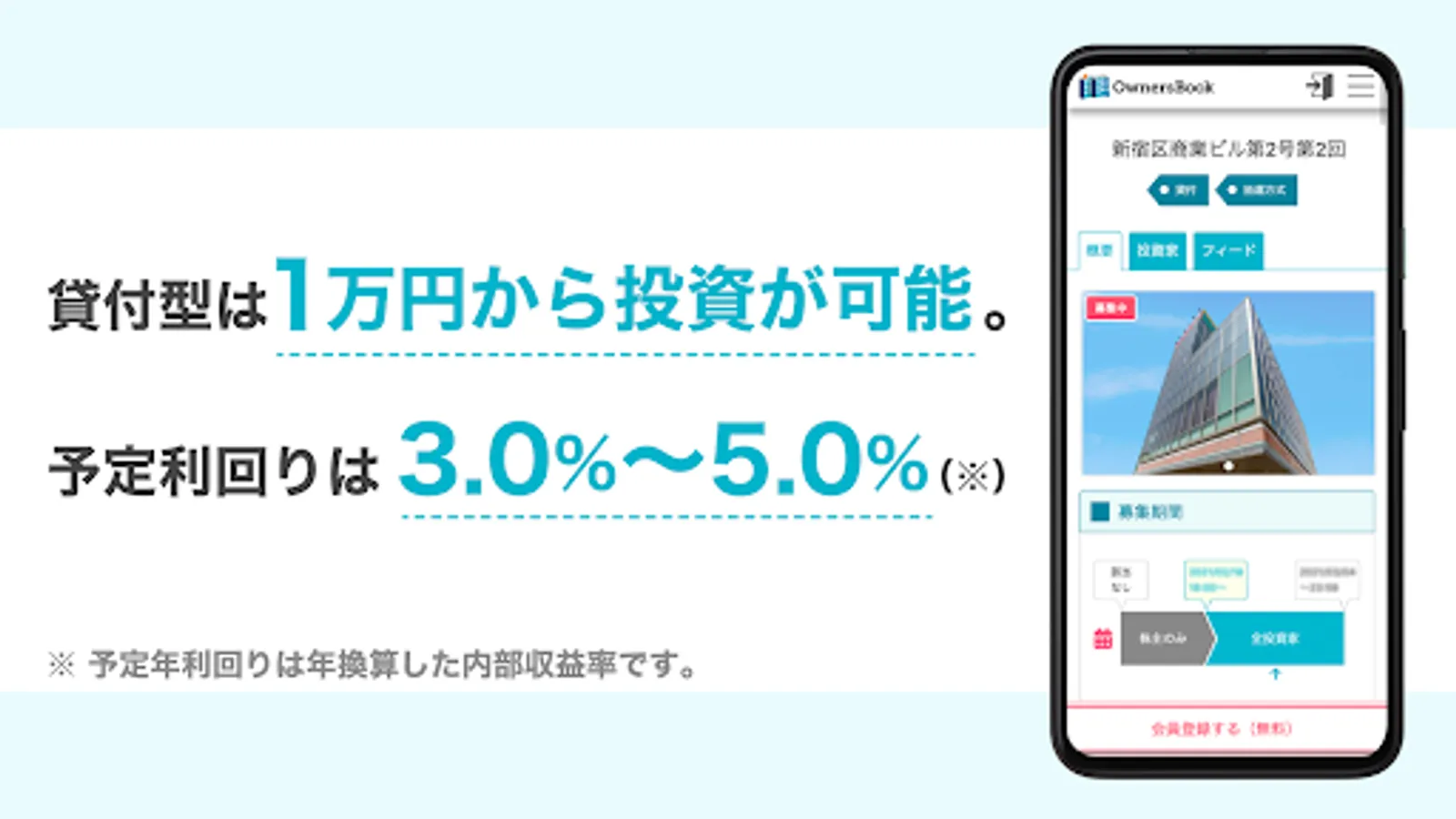 Lending type: Also called social lending. Funds collected through crowdfunding are used to lend to companies that want to borrow money, with real estate, etc. as collateral. Investors will receive interest and principal on the loan from OwnersBook as dividends and return of capital.