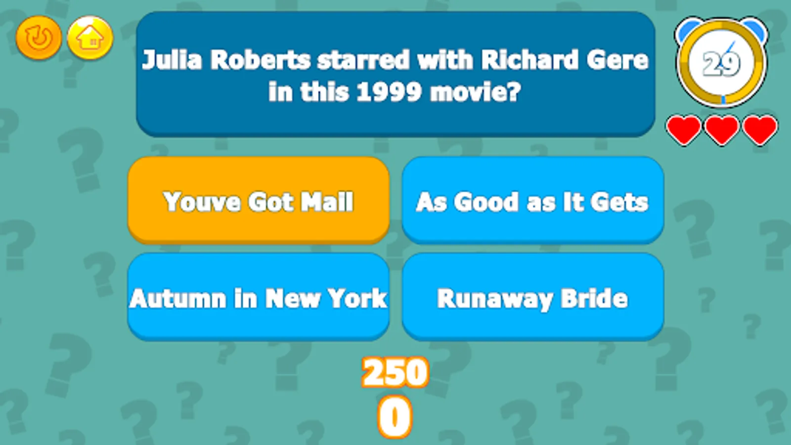 Movie Trivia has never been so much fun. Choose from the most popular movie actors and actresses in Hollywood, including Bill Murray, Brad Pitt, Denzel Washington, Julia Roberts, Sandra Bullock, Steve Martin, Tom Cruise, Tom Hanks and Will Smith. Challenge yourself or have a movie trivia night with friends and family in Party Mode!