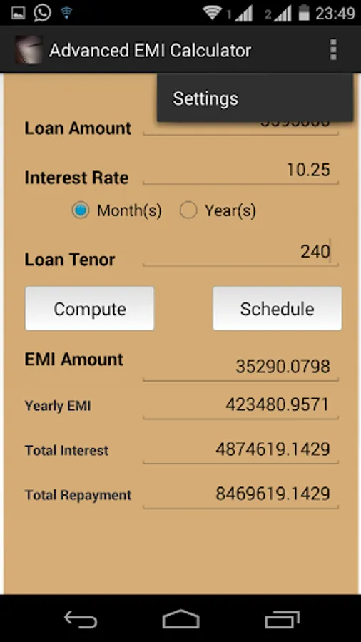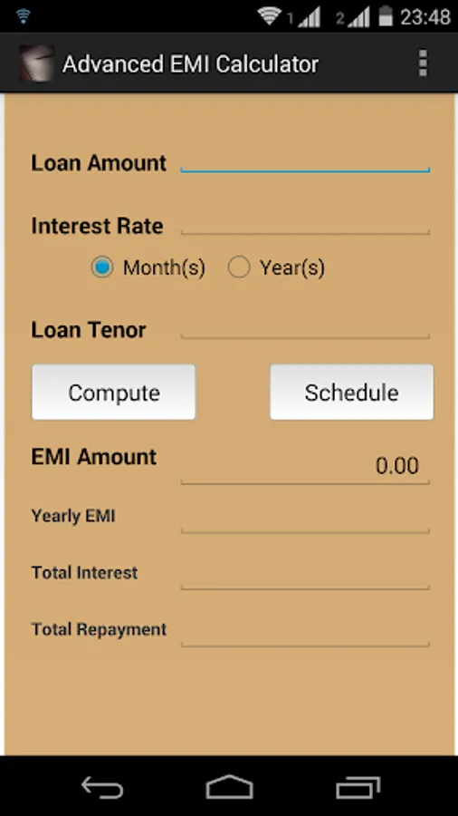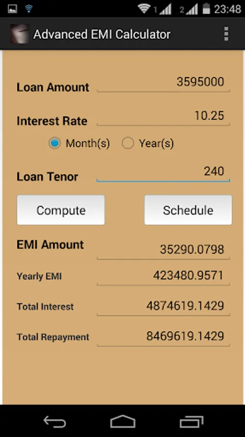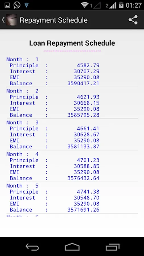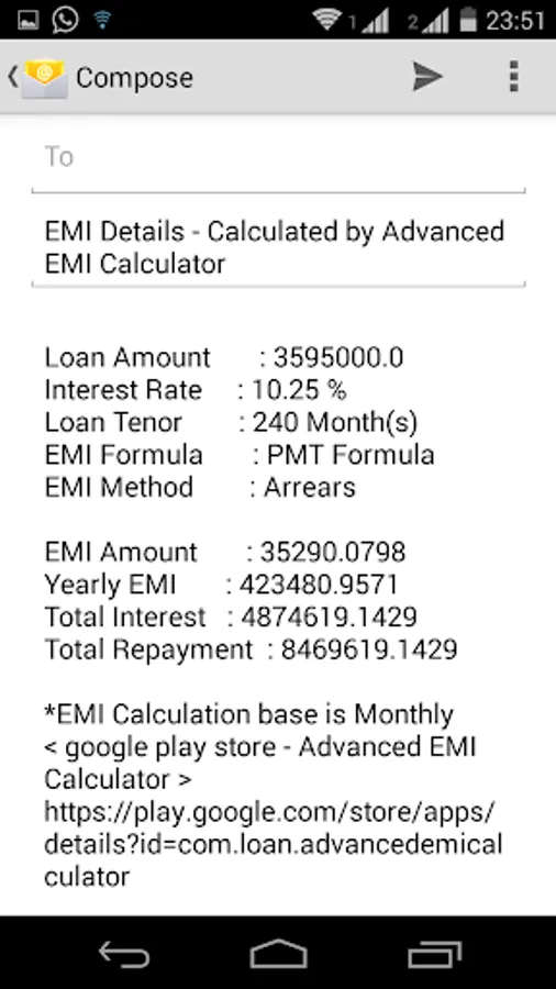 Computes EMI Amount, Yearly EMI, Total Interest and The Total Repayment and can be shared via Email or Any Messaging Application