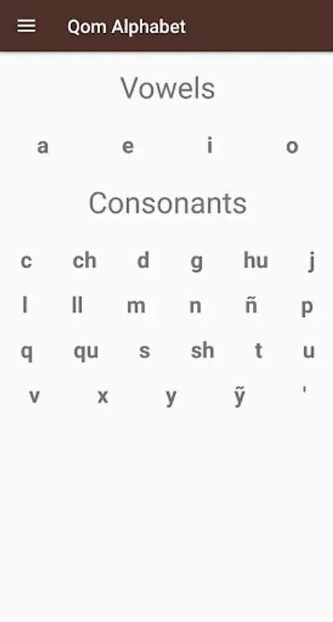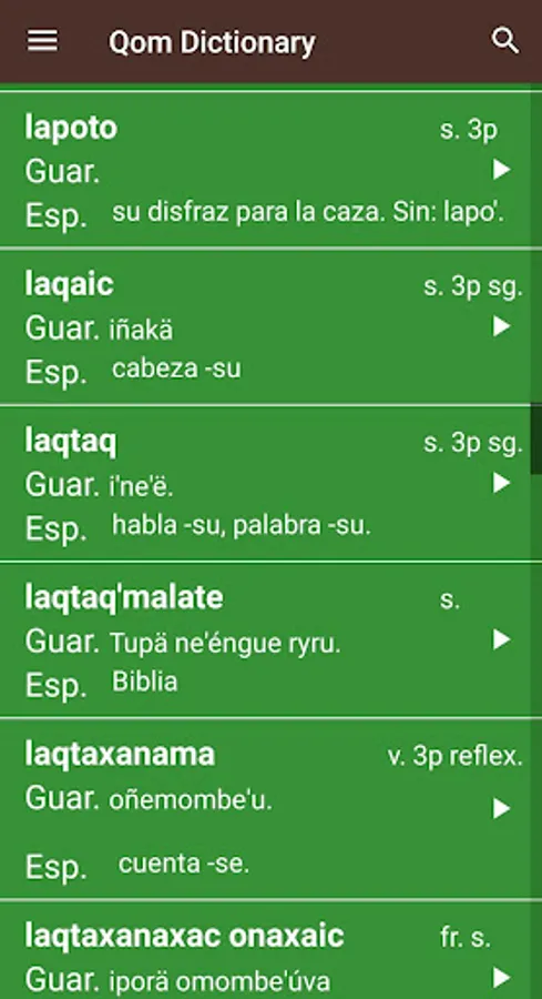 Qom is a language primarily spoken in the Paraguayan and Argentinian Chaco. Although Qom exists in all these parts often the spelling and sometimes the pronunciation can vary by region. This app was developed in partnership with over 60 teachers from the community Rosarina Cerrito-Franciscano in Presidente Hayes, Paraguay in hopes of being a resource for anyone interested in learning the language. In addition to the teachers, critical collaborators include Mark Lobin who led managed all activities in relation to the development of the app and Eugen Amadeus Benz who served as a linguist in the standardization of the language. This version is an expansion of the first version of the app done with Professor Eriberto Caballero serving as a Qom language specialist and Alma Perez who was instrumental in cross cultural communication, language recording and analysis.