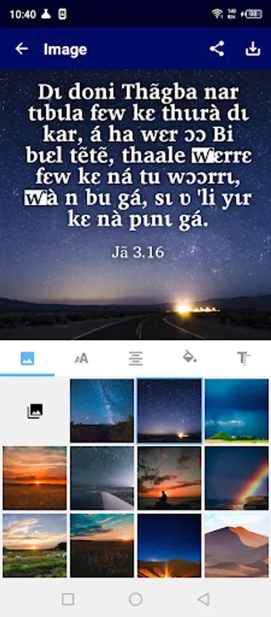 • When you tap on a verse, an image button is displayed on the bottom toolbar. When this button is pressed, the screen appears. You can choose the background image, move the text around the image, change the font, text size, alignment, format and color. The final image can be saved on the device and shared with others.