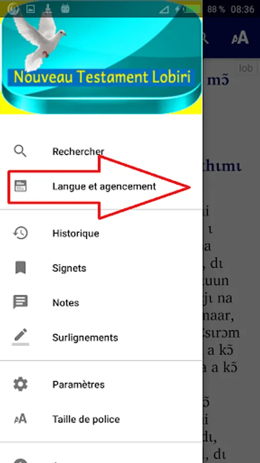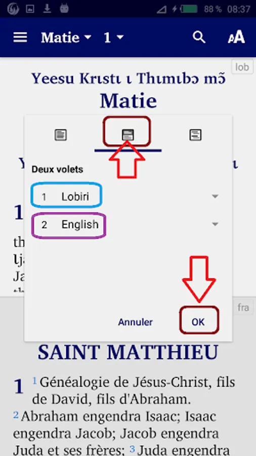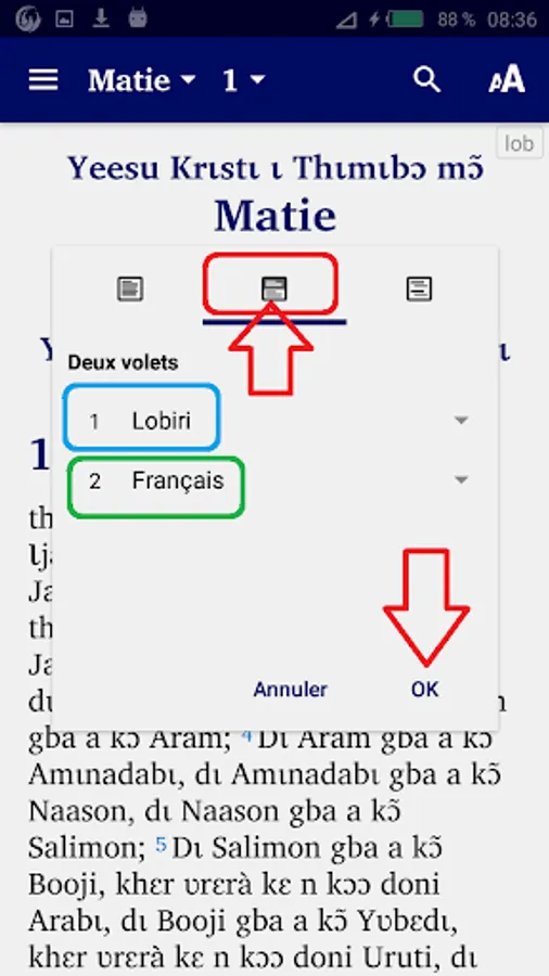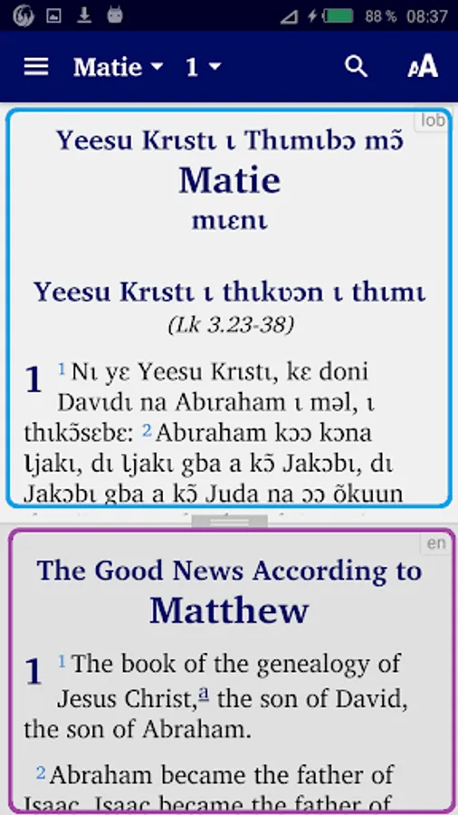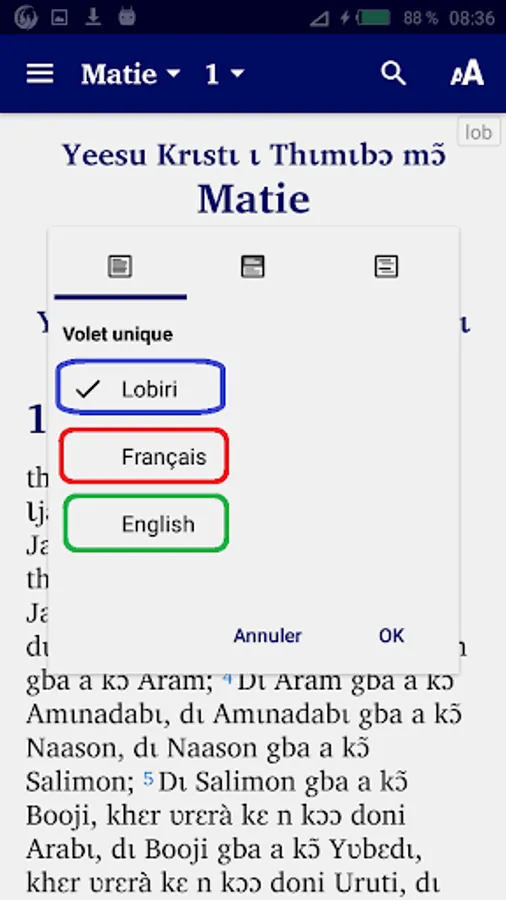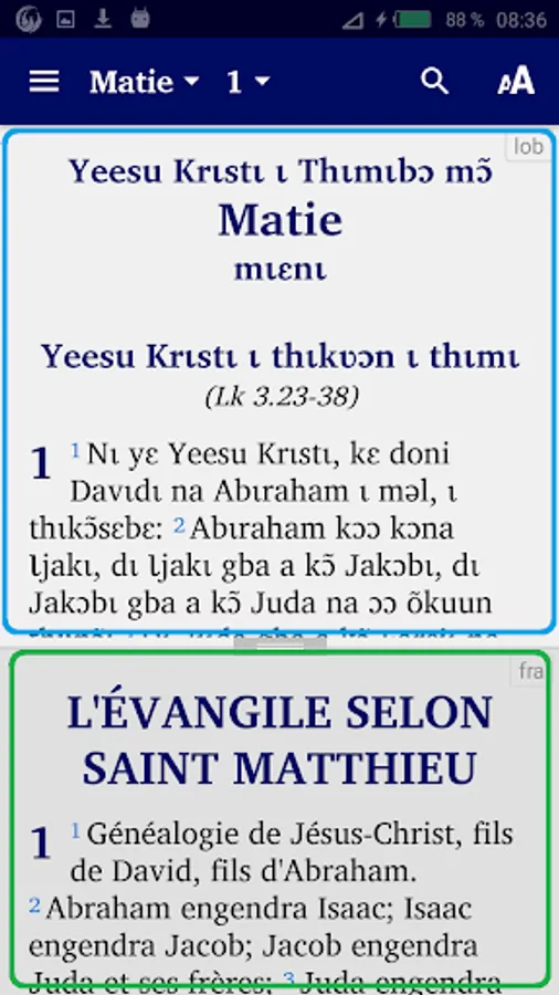 - “verse by verse” to display a verse in Lobiri followed by the same verse in French or in English.