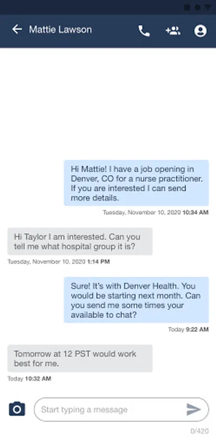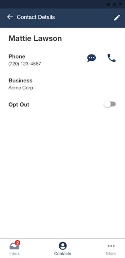 The message view is easier to read and looks like a native messaging app. There is added functionality to send a photo in the message. From this screen the user can call the contact, assign the conversation, and view or edit the contact details.