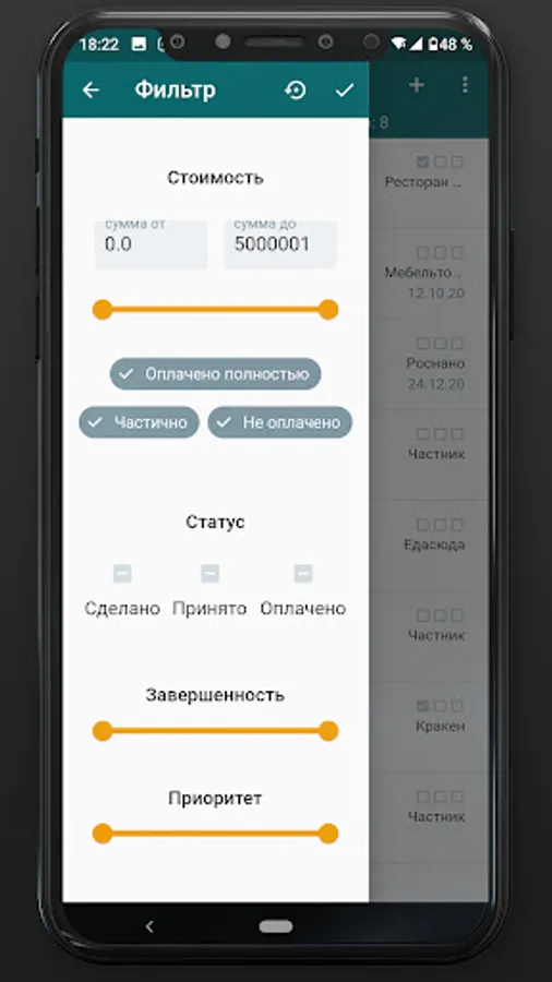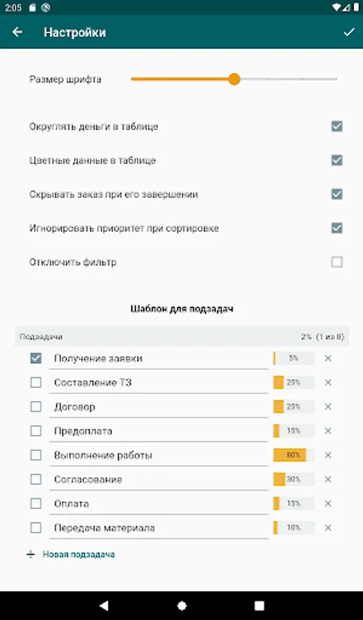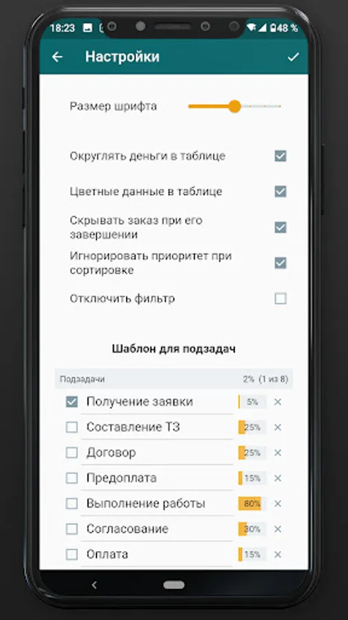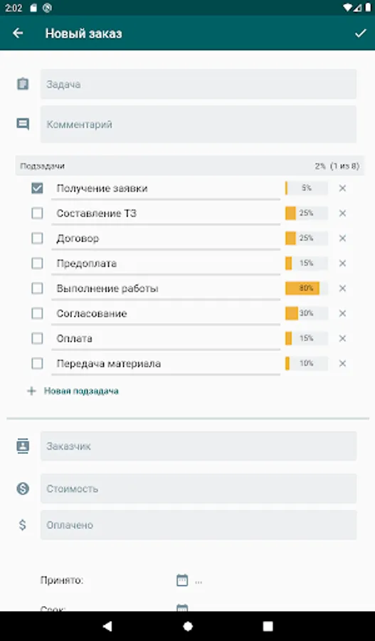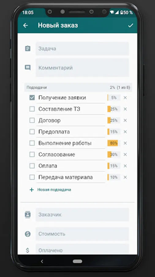 - For each subtask, you can set the percentage of influence on the completion of the order.