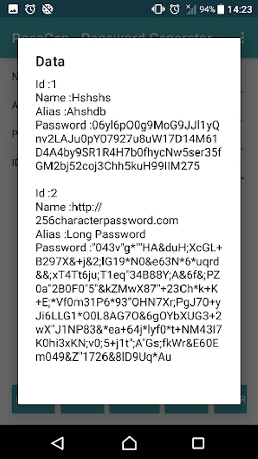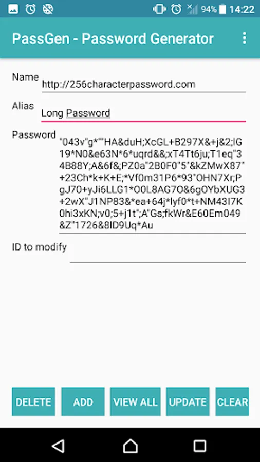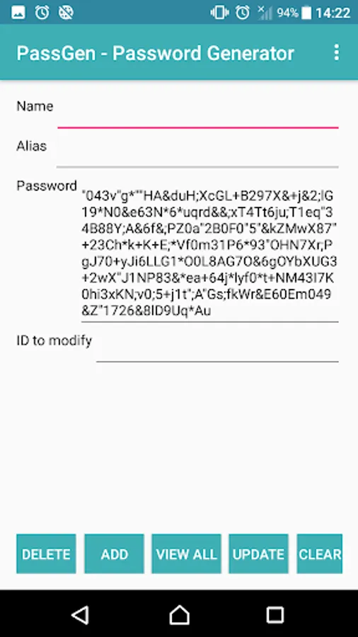 A password Generator and Manager, generates passwords and permits you to save and modify in an onboard database. You can save with a name and alias or url if you prefer. Update by ID.