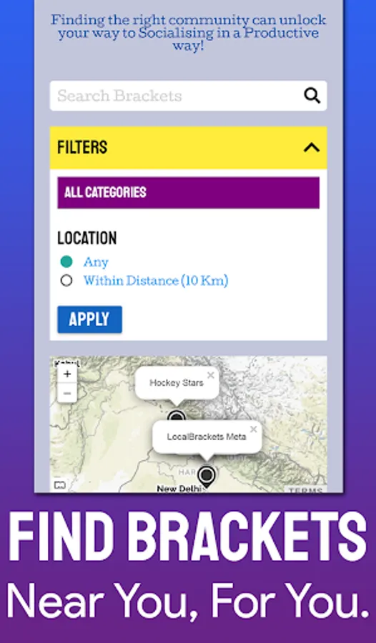 LocalBrackets is a community driven platform that offers people the opportunity to socialise with those who share their interests. LocalBrackets makes it easy for users to create, find and join brackets, and collaborate with ease. LocalBrackets thus helps communities foster and develop.