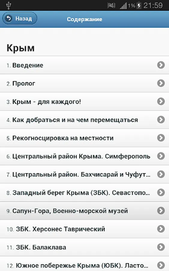 The guide contains a story about such settlements as Yevpatoriya, Sevastopol, Balaklava, Simferopol, Bakhchisaray, Alupka, Yalta, Gurzuf, Alushta, Sudak, Koktebel, Feodosia, Kerch. See "Information" contains links to useful sites where you will find the schedule of ferries in the Crimea, the list of top attractions and other useful information.