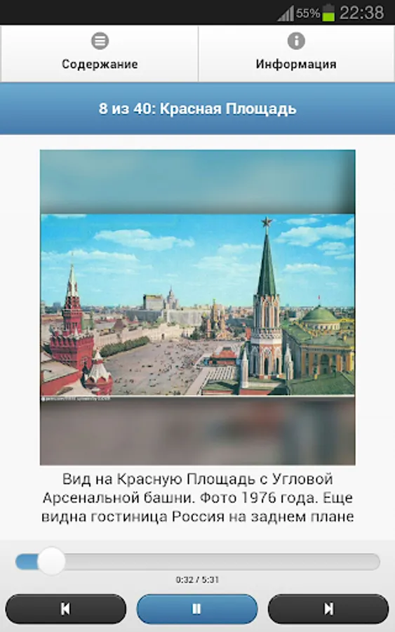Audio tour begins near the exit of the metro station "Okhotny Ryad" on Manege Square. and continues Red square. You will get acquainted with the main Moscow's main attractions: the Cathedral of Our Lady of Kazan, gum, Cathedral "Vasiliya Blazhennogo", the Kremlin towers, necropolis with mausoleums. After the Red Square walk continues along the Alexander Garden, walking through which you will learn many interesting facts. Tour ends at the Manege Square, where you will be able to go to the Kremlin or wherever else you want. Join now without hesitation!