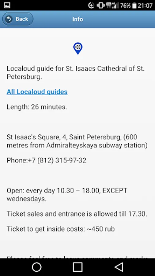 This audio-guide was developed by Localoud with one of the most professional local guides, Victoria Romanenkova and is accompanied by authors' photographs of St. Isaacs interiors.