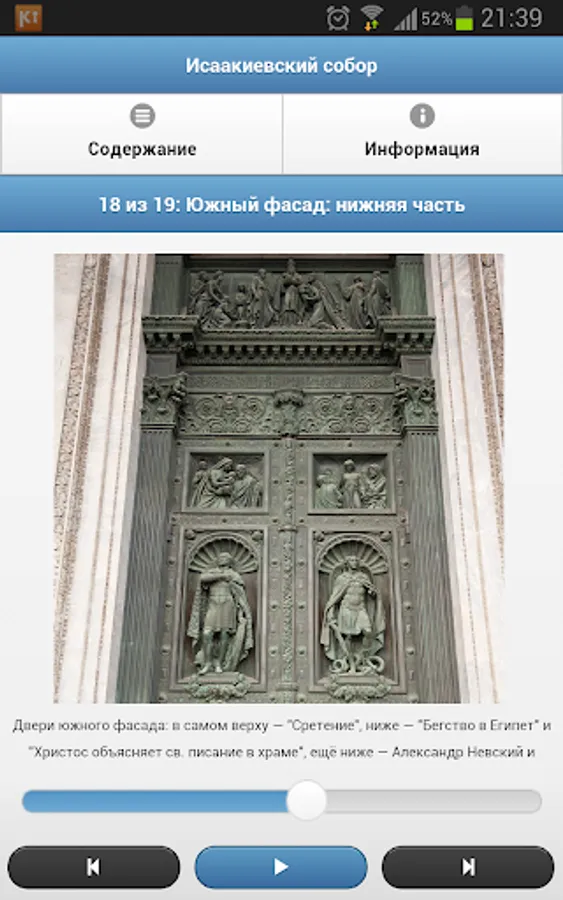Mobile guide in St. Isaac's Cathedral of St. Petersburg - a free tour in audio format with interesting facts about the cathedral and the author's photographs. During a half-hour tour around the cathedral, you will learn many interesting facts about the history of its creation, the importance of each of the sculptural groups, as well as the little things that are not always visible even for experienced travelers.