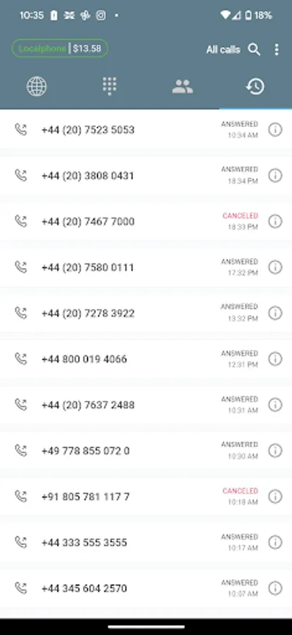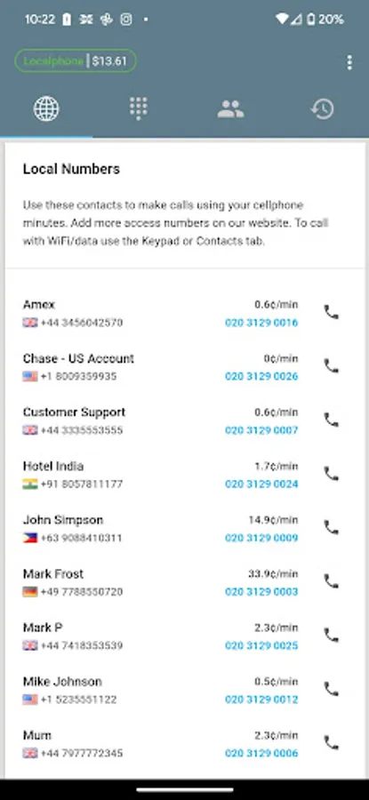 • Easily access your existing Localphone contacts on your mobile device, enabling you to make affordable international calls with just a single tap