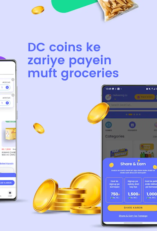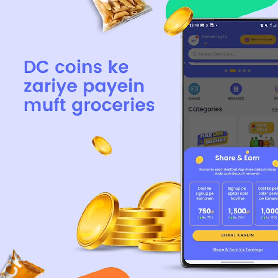 Ab DealCart Application doston aur azeezon ke saath share karein aur jeetain DC Coins, jitna ziada aap share karenge, utnay ziada coins jeet payenge. Sirf yeh hi nahi, unn coins ke zariye payein online shopping pe discounts! 100 DC Coins, Rs 10 ke barabar hotay hain.