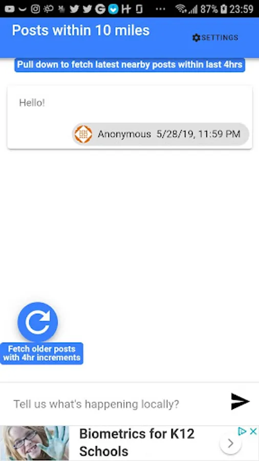 Connect to who's around you locally. You specify the radius. You will see messages that were posted within that radius. Likewise, you can post messages anonymously other people can see. This app allows you to engage in real-time conversations with the people around you.