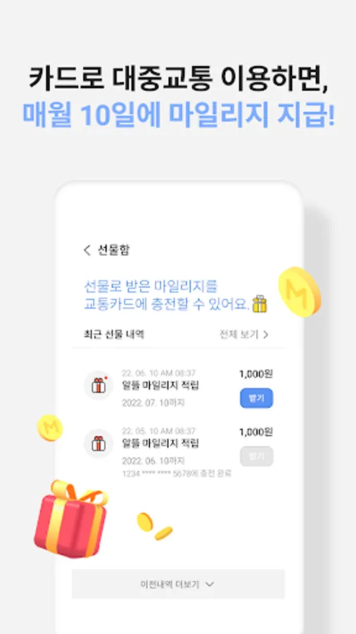 - If you use public transportation with the Chungnam Economical Transportation Card, mileage is paid in a gift box on the 10th of every month!