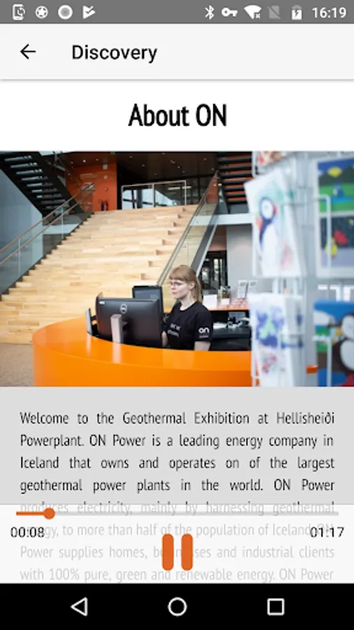 Welcome to the ON Geothermal Exhibition at the Hellisheiði Power Plant in Iceland. The audio guide will lead you around the exhibition and tell you about the exhibits.