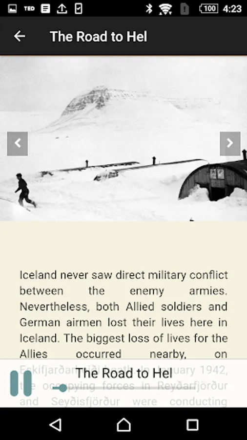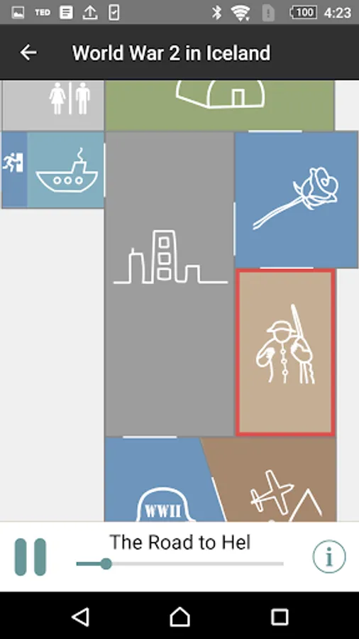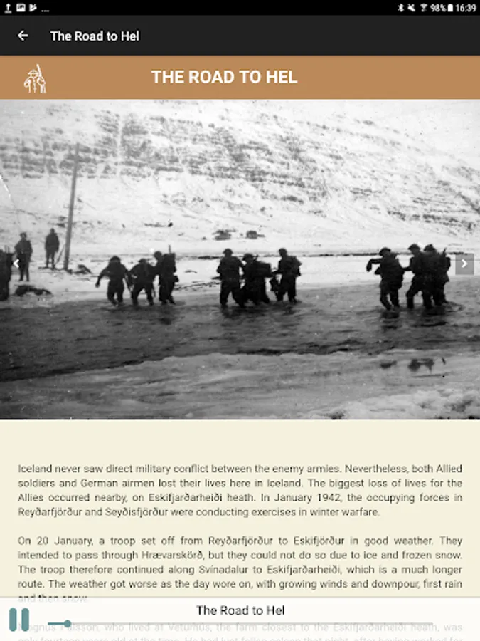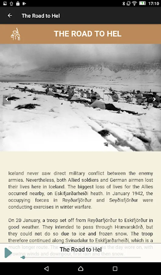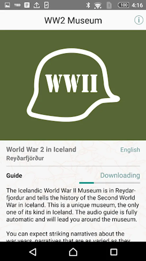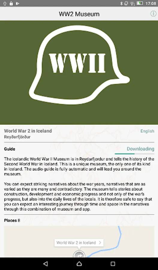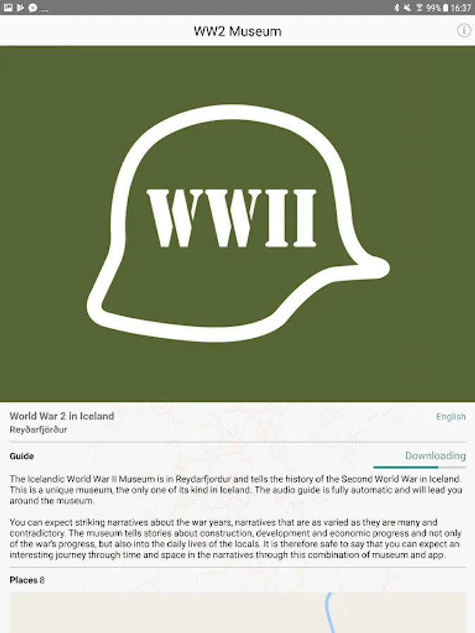 This automatic audio-guide is for the Icelandic World War II Museum in Reydarfjordur, Iceland. It tells the history of the Second World War in Iceland. This is a unique museum, the only one of its kind in Iceland. This audio guide app will lead you around the museum with automatic activation of the audio guide.