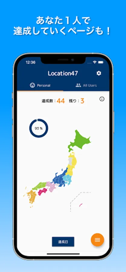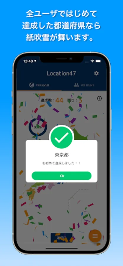 ・ If it is the first prefecture to be achieved, confetti will fly in addition to the dialog, and all app owners will receive a PUSH notification of achievement.