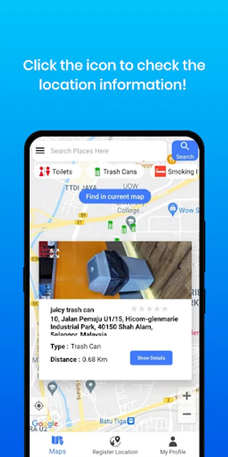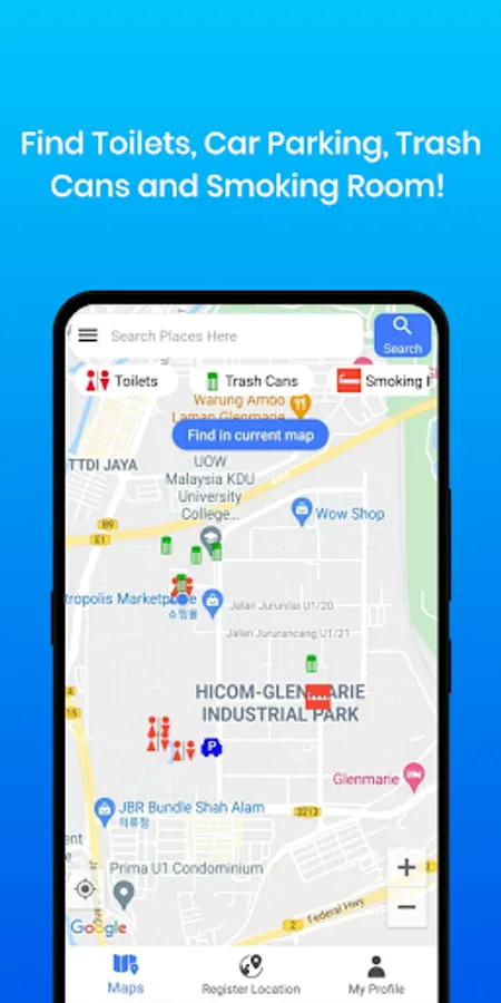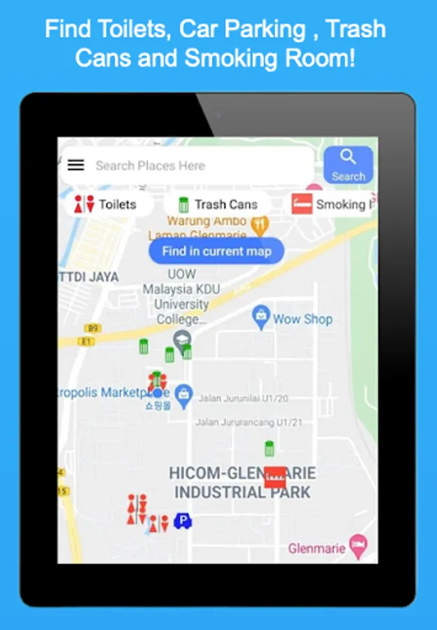 This map app is an app to find ATM, Public Toilets, Car Parking, Trash cans, and smoking room.