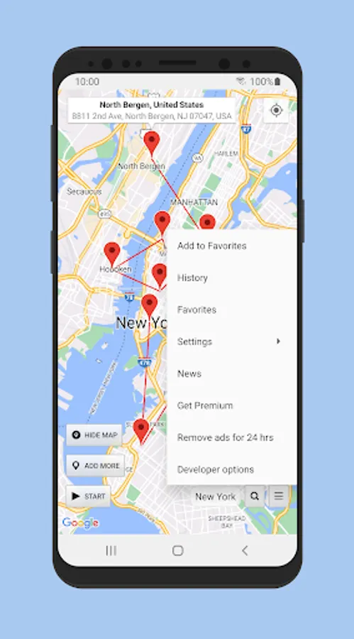 * You can add multiple pins (Add more) on the map and set an interval in seconds to change the location to each pin. Please note that in Android the interval will vary significantly when you turn off your screen/the device goes into sleep mode. To clear the pins, tap on Done and then long press on the map or search for a location to set a new single pin. You can also change the pins from the location status screen (tap on where it says Multiple locations).