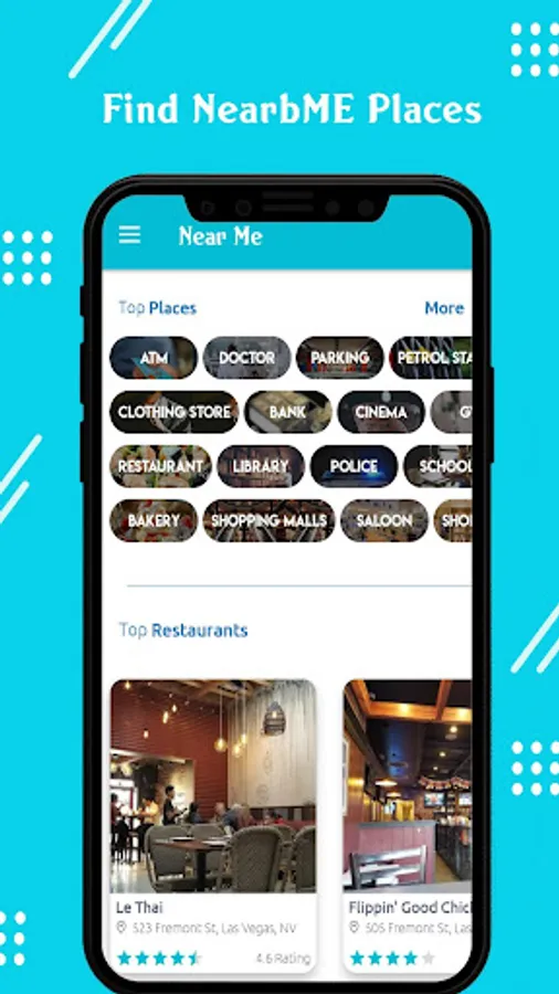 Near Me is an easy to use app with map view which helps you find ATM, Bank, Bus Stop, Hospital, Restaurant, Car Repair, Pharmacy, Park, Beauty Salon, Super Market, School, Temple, Fire station, Government office, Shopping Mall, Fuel Station,Hotel, Taxi, Movie Theater, Library, Police, Gym, Car Rental, Book Store, Parking, Bar,Café,Bakery, Residency, Beach, Cloth Store virtually anything near you.